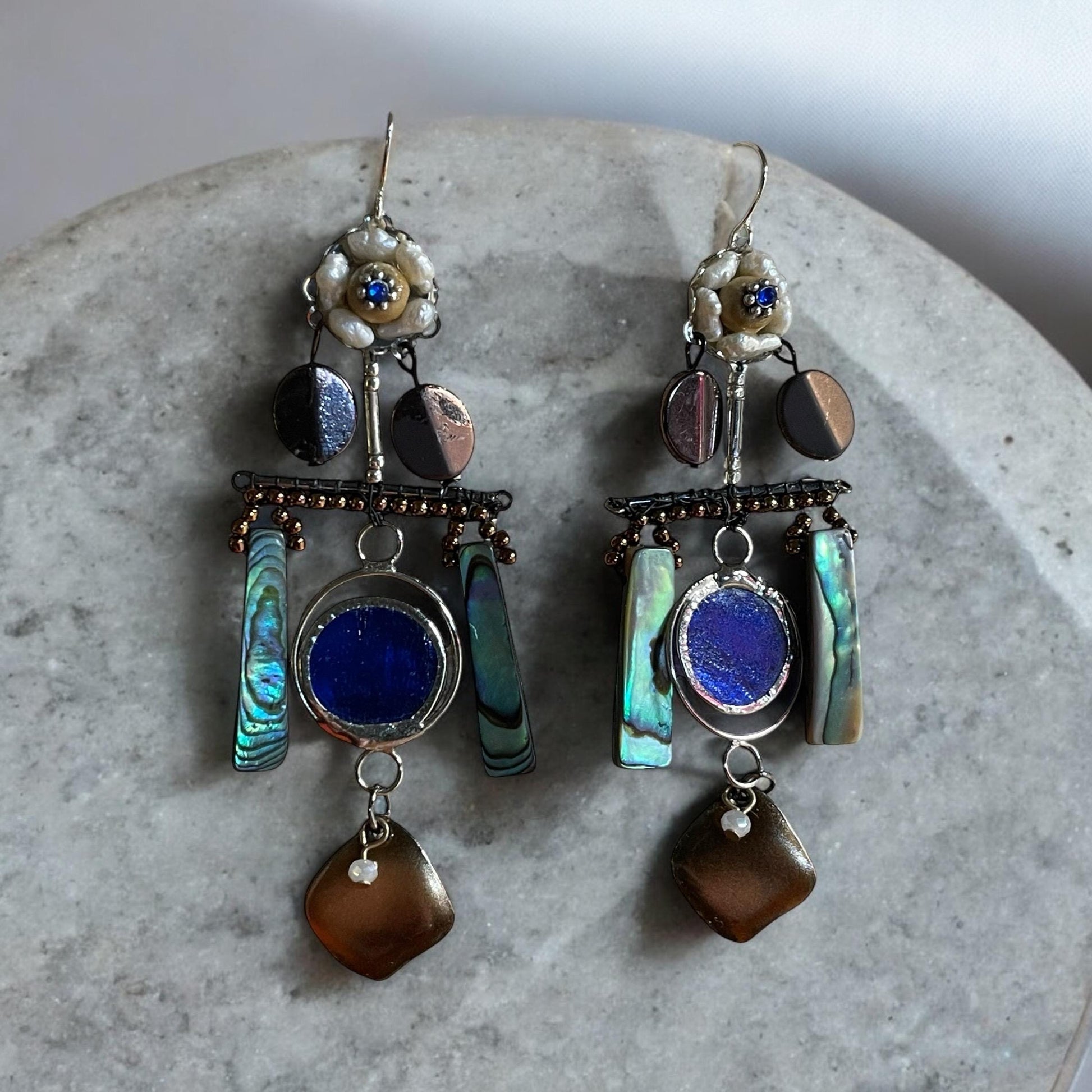 Abalone mixed media collage earrings with mixed metals and findings, pearls, wood, beadwork and abalone shells.