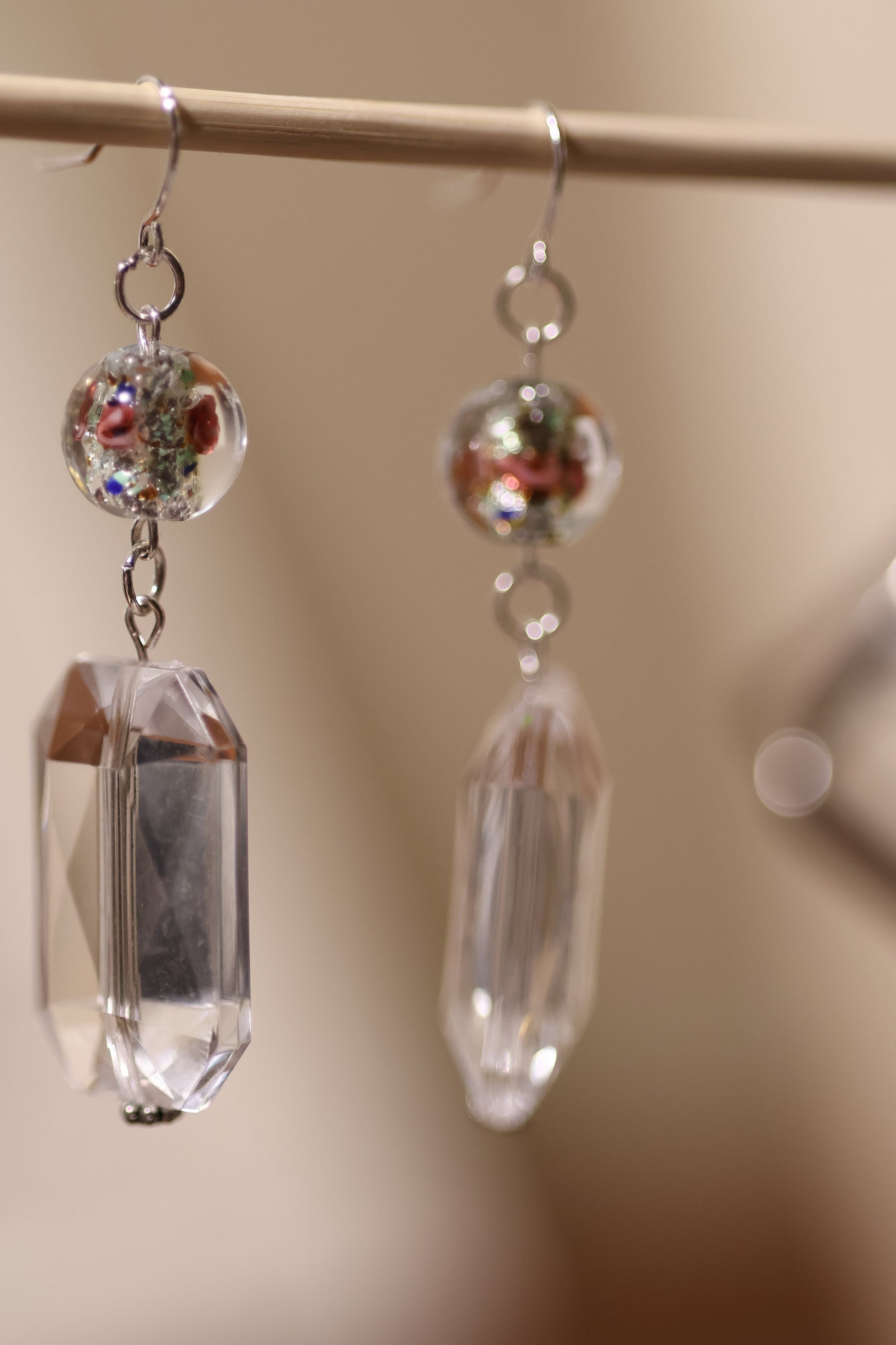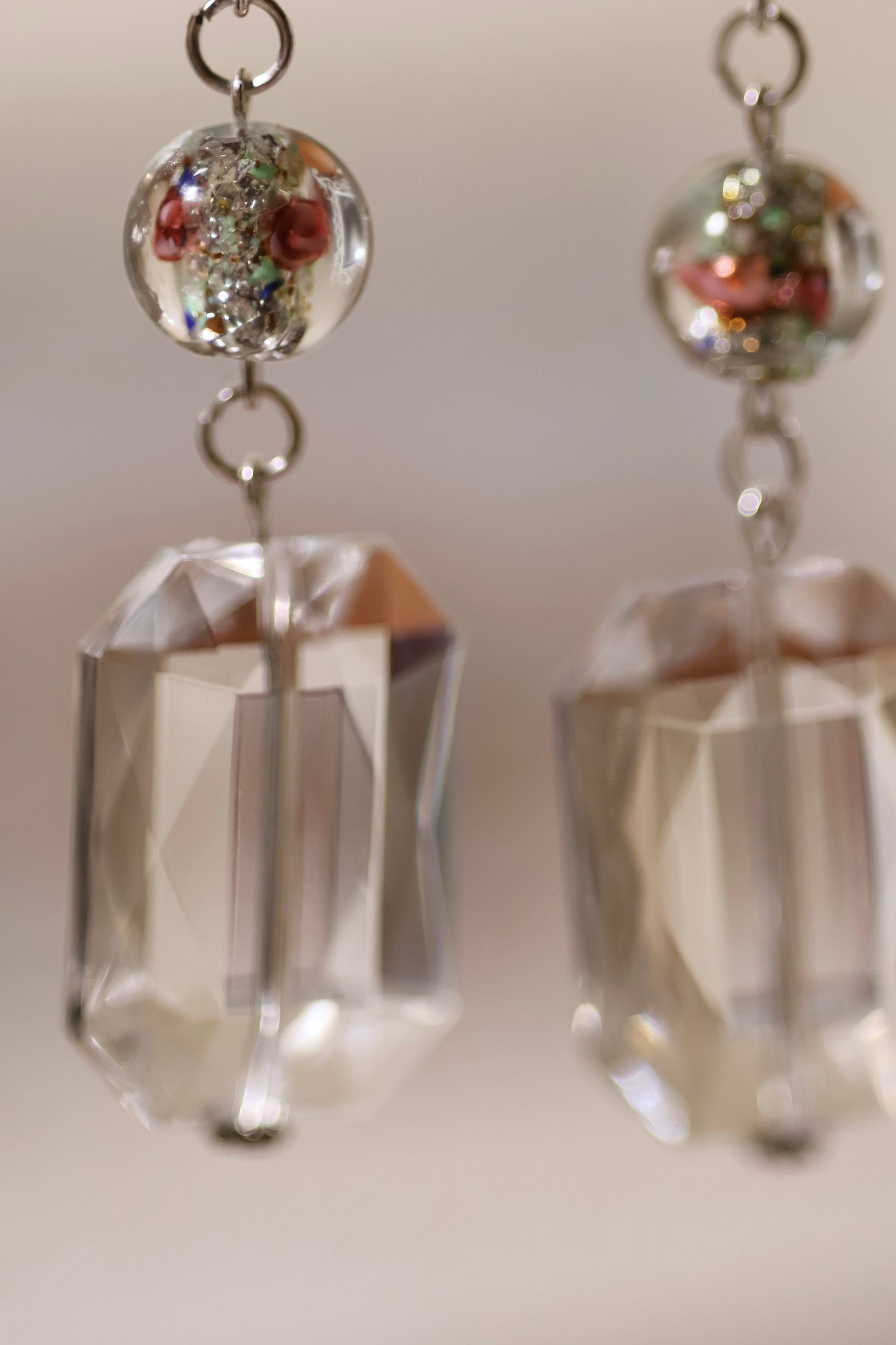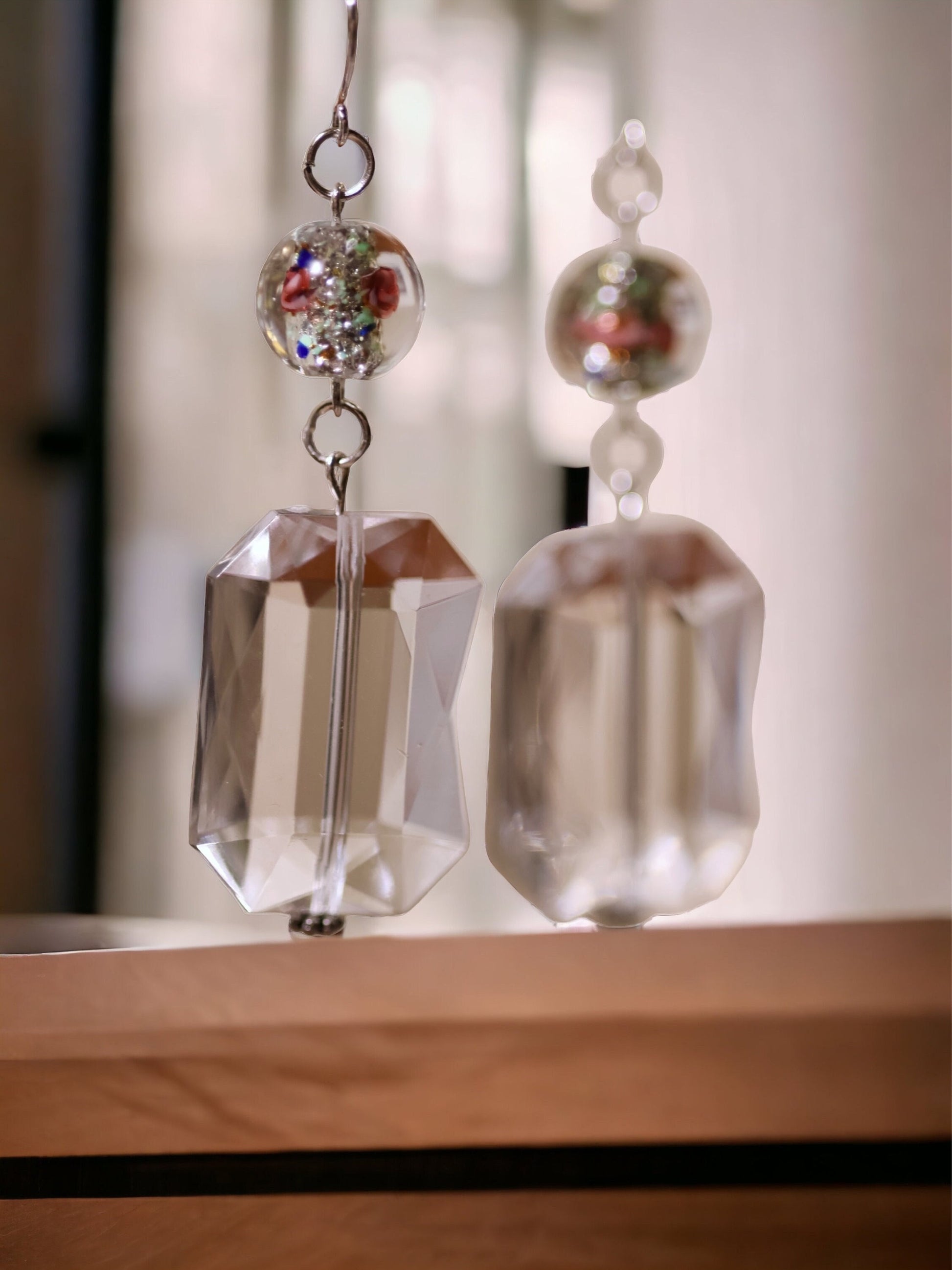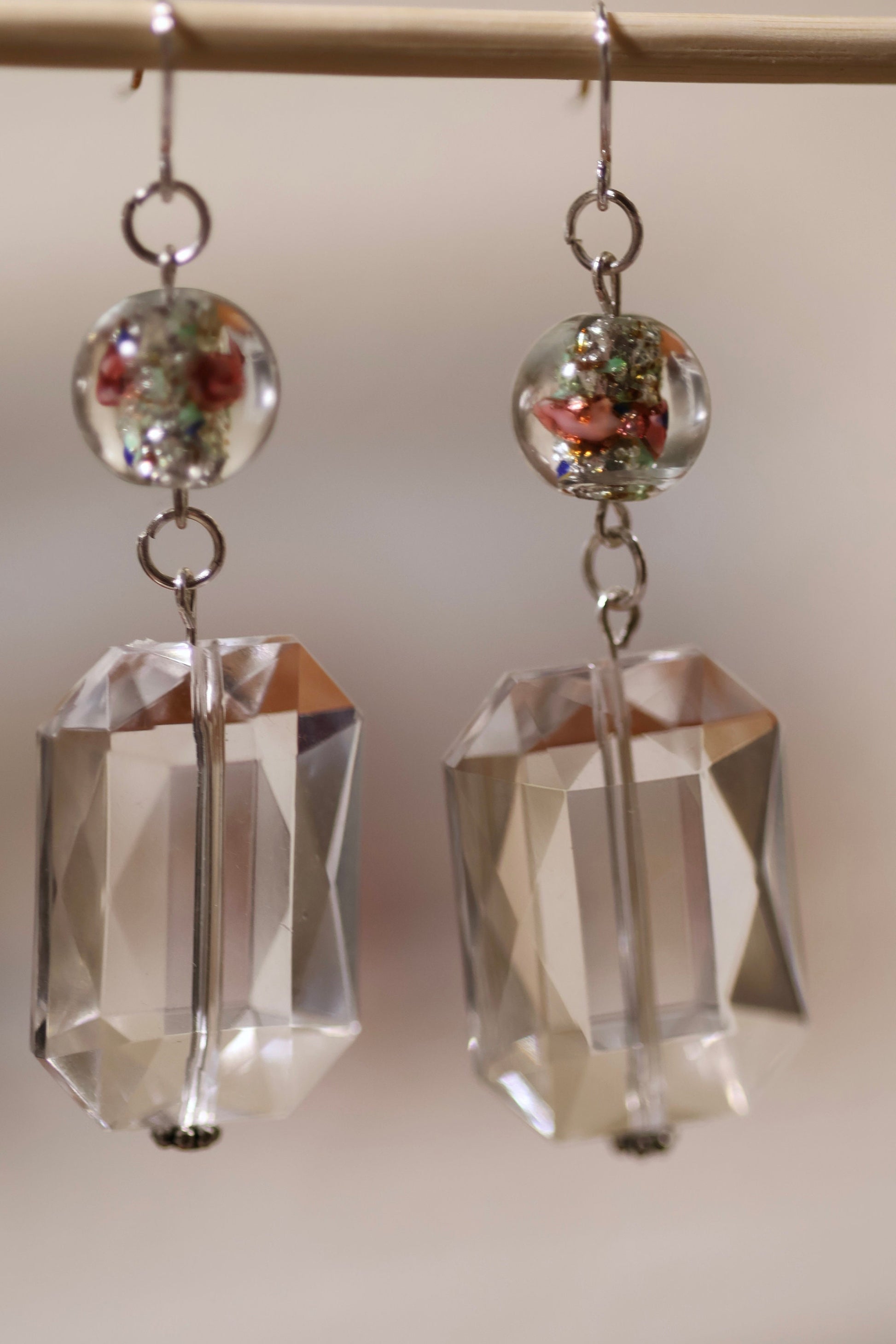 These earrings look like beveled glass when worn but they are actually a durable vintage (acrylic, I think?) plastic that's easy to wear. These earrings are trimmed with vintage Czech foiled lampwork glass floating rose beads. The earrings measure a little over 2 inches and would look great with just about any outfit.