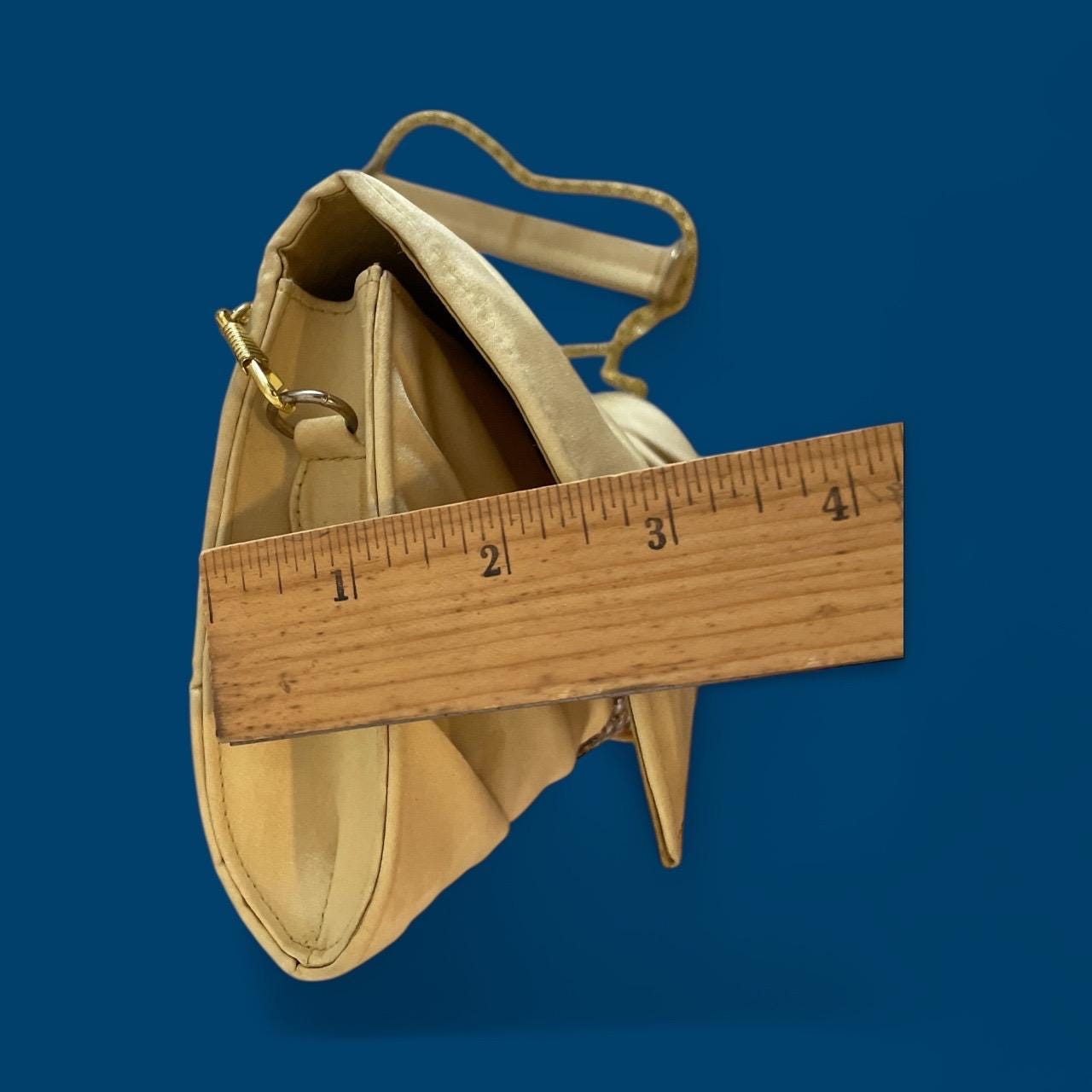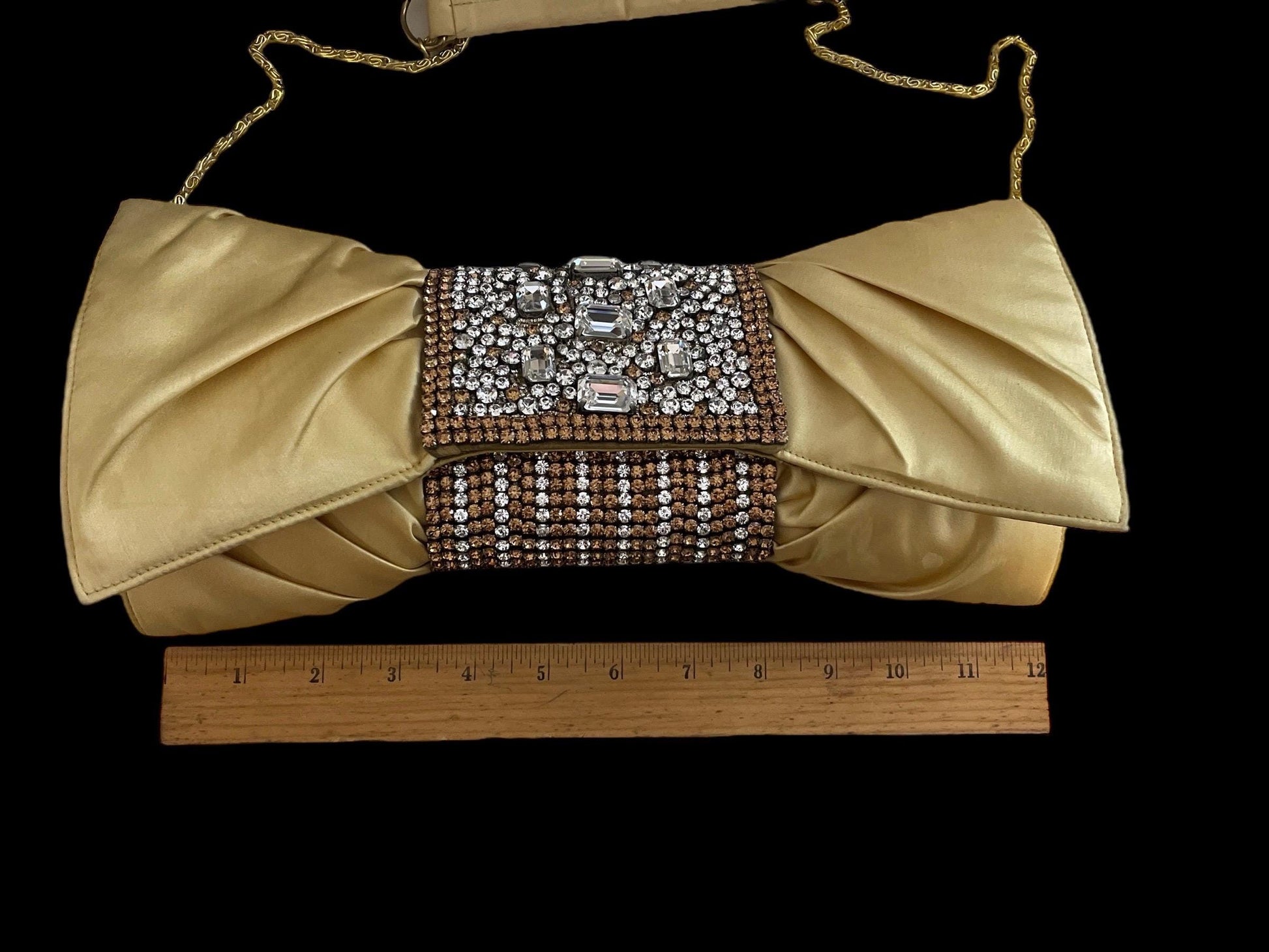 Made from rich gold satin fabric, this formal satin purse measures approximately 10 inches long, 5 inches high, and 1.5 inches deep, providing a compact yet spacious design perfect for essentials. The sculptural bow silhouette purse is adorned with hand-set crystals and rhinestones in clear and bronze tones, creating a jeweled evening clutch that sparkles under event lighting. A padded chain handle tucks neatly inside when not in use, offering versatile carrying options.