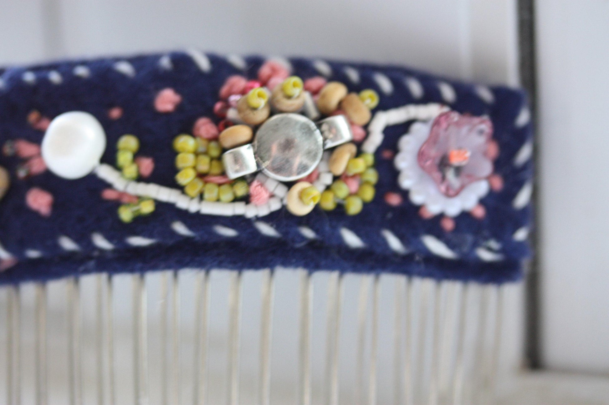 The deep navy fabric base is accented with soft pinks, greens, and neutral tones, giving this piece a balanced yet expressive look. The metal comb provides secure hold while allowing the decorative top to sit beautifully in the hair.