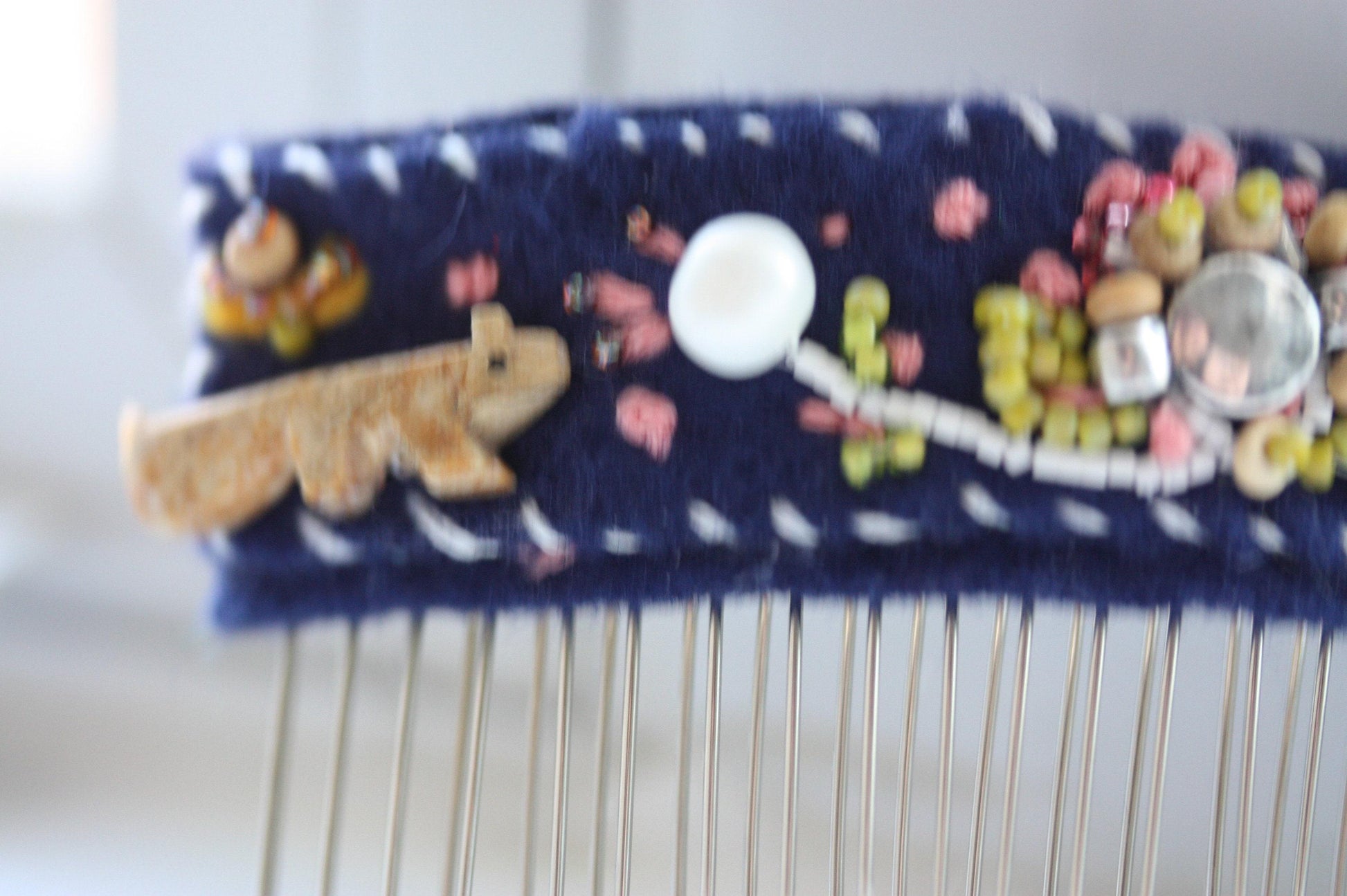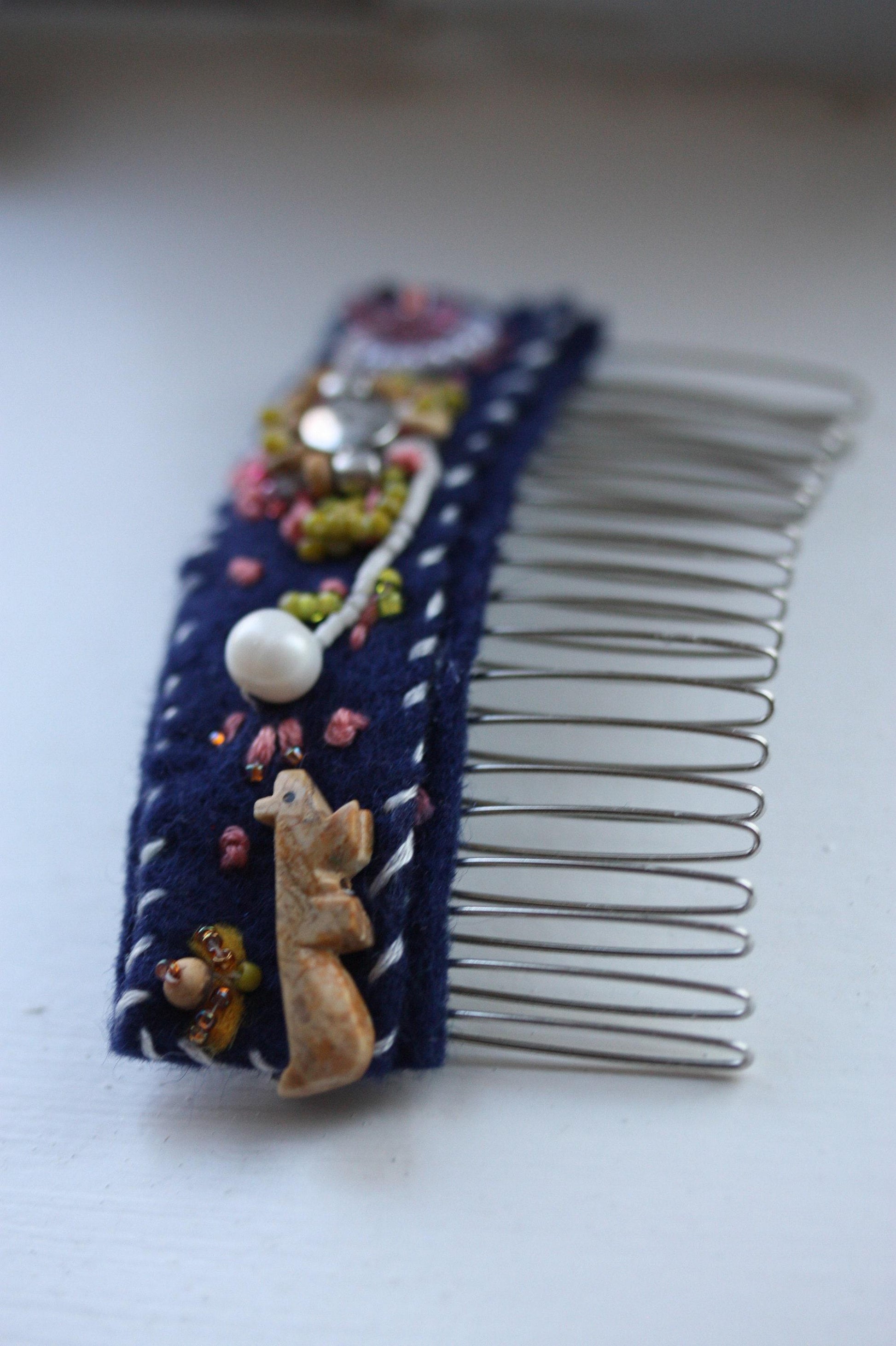 A thoughtfully crafted handmade hair comb, featuring a fabric-wrapped top embellished with intricate embroidery, hand-applied beads, and decorative accents. Each element is carefully placed, creating a textured, organic design with a folk-art, artisan feel.