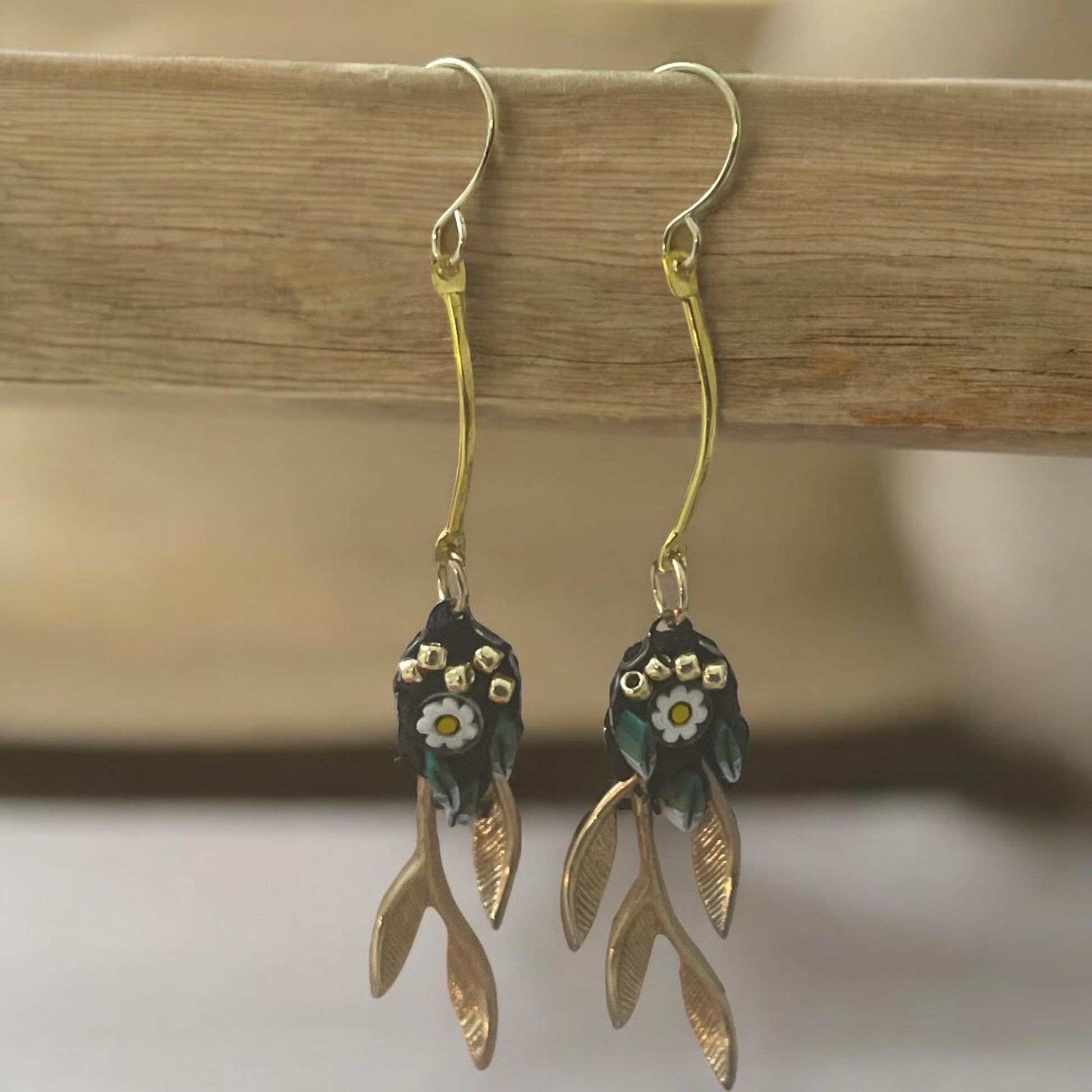 Handmade micro mosaic with gold leaves - long dangle earrings
