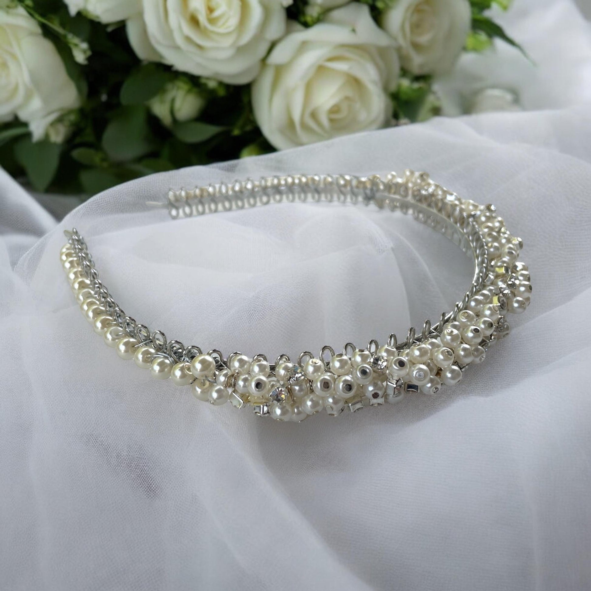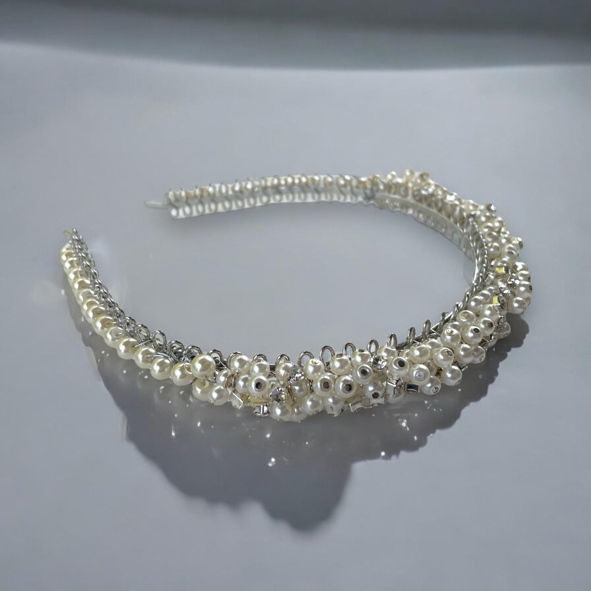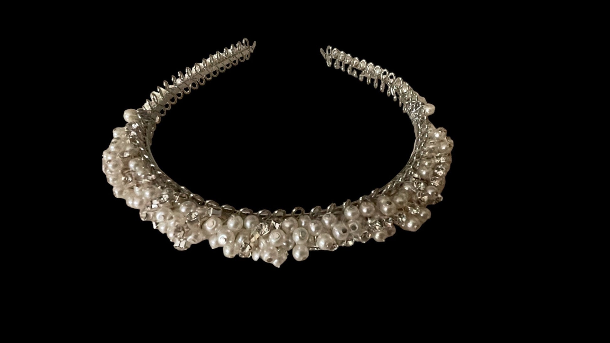 Stunning handmade head band for hair - with rhinestones and pearls on metal base.