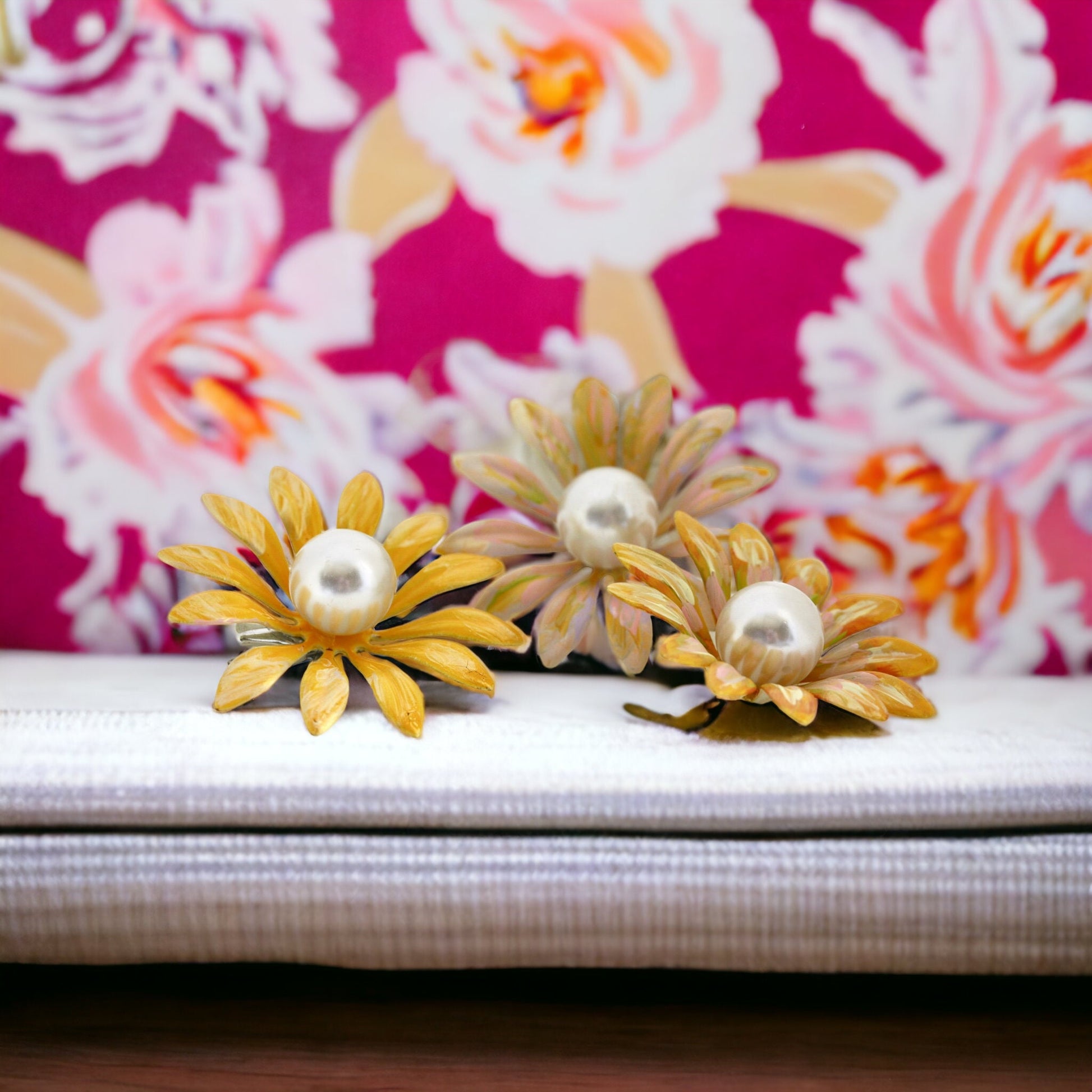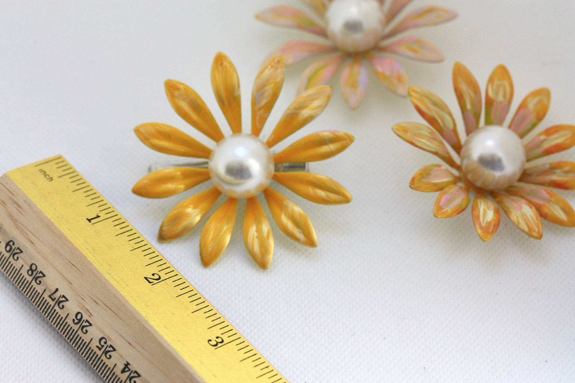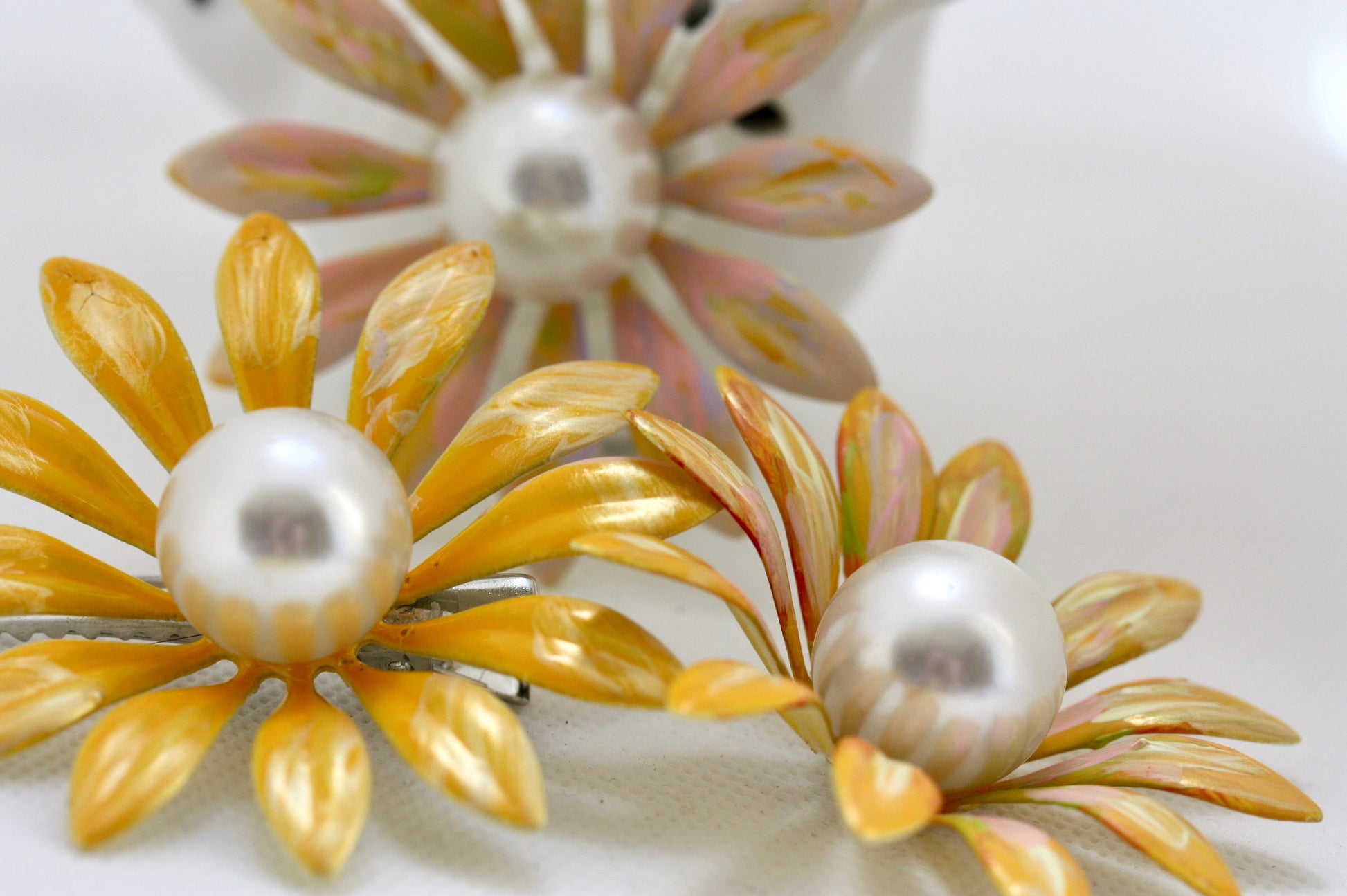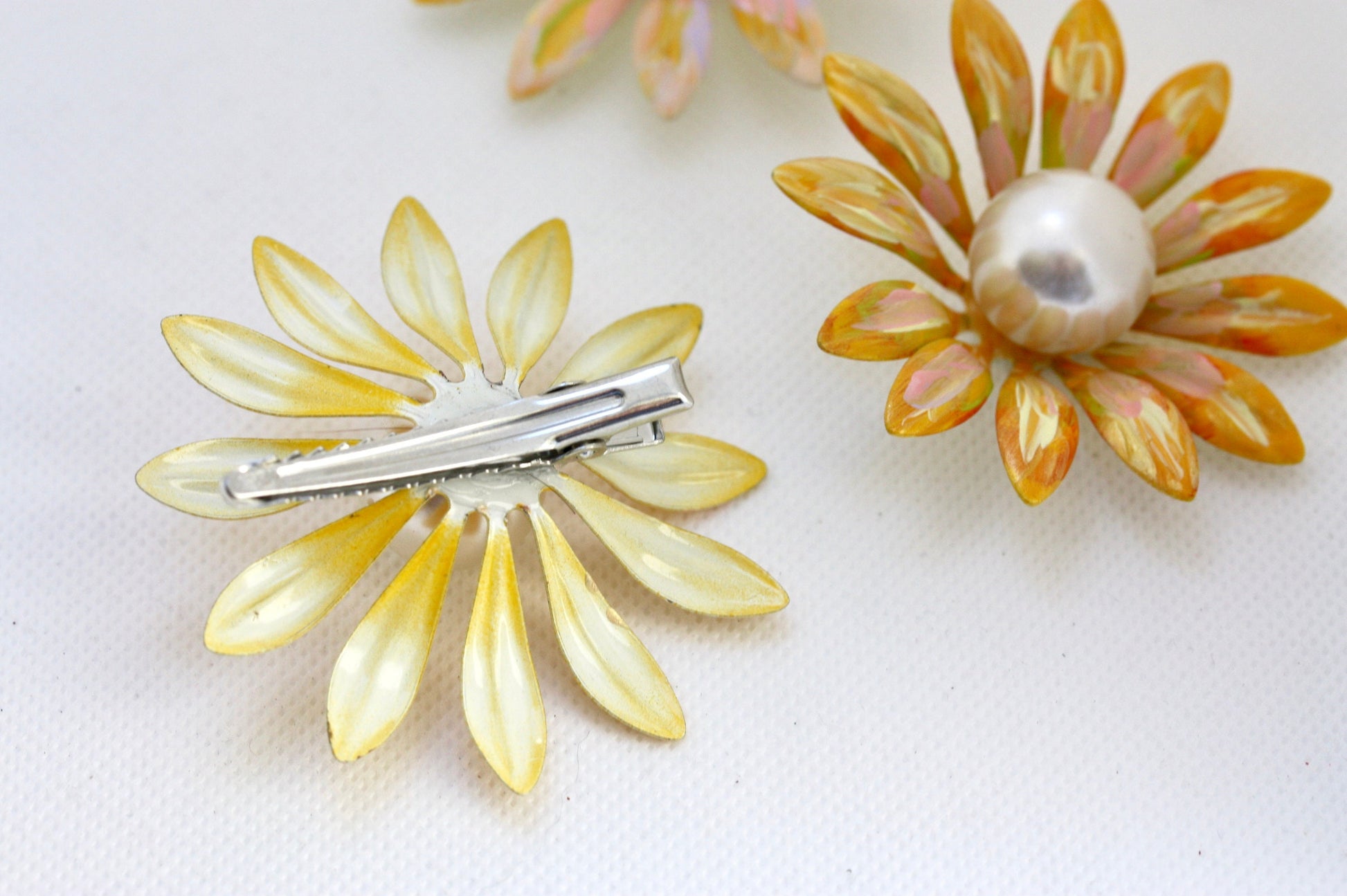Handpainted vintage metal enamel daisy 3" flower hair clips with large faux pearl centers - or pin