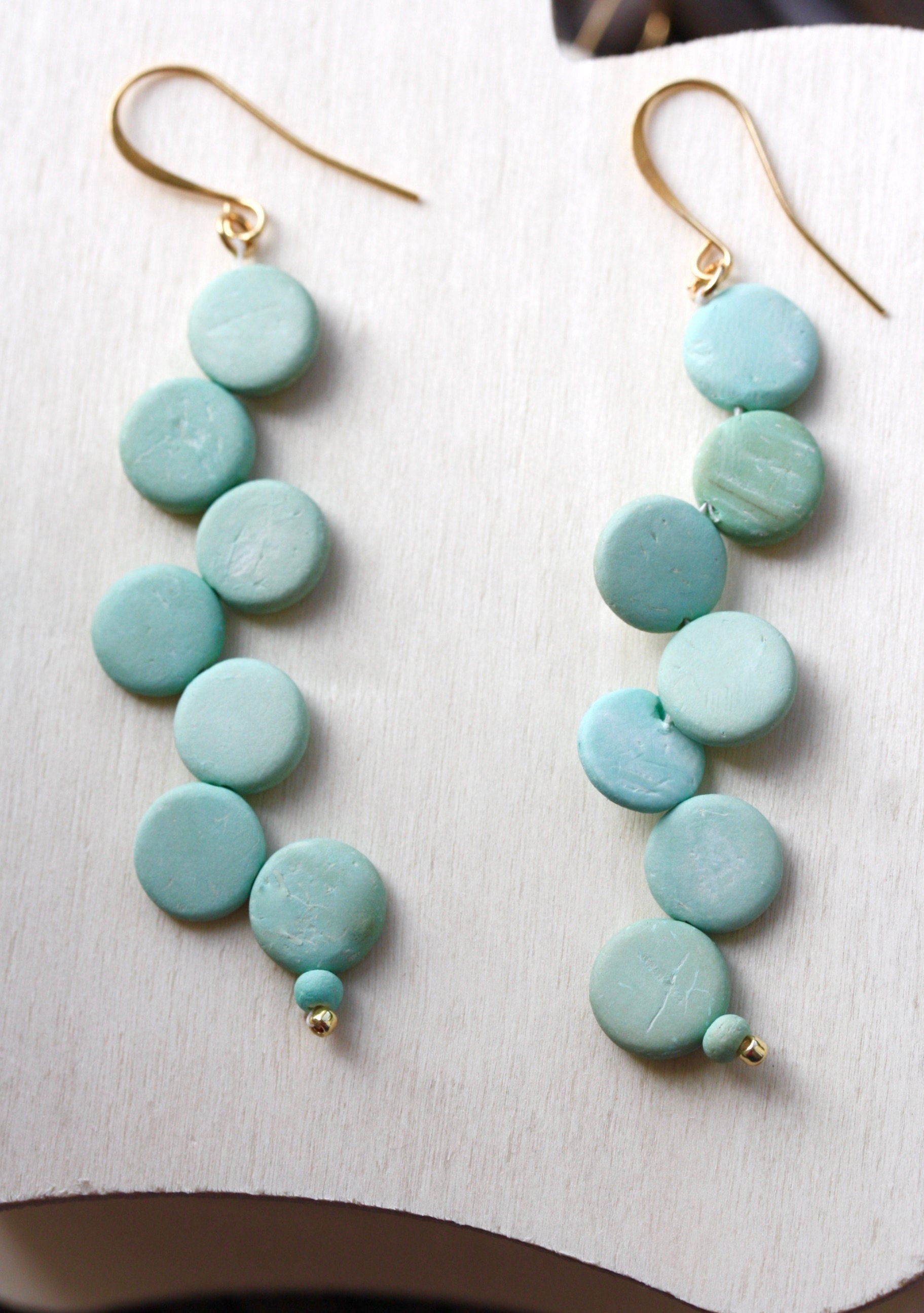 I made these earrings using upcycled vintage aqua wooden round beads. They have a mainly flat front and back. The earrings change shape a bit when worn, depending upon how the circles fall - sort of like a little mobile on your ears.
