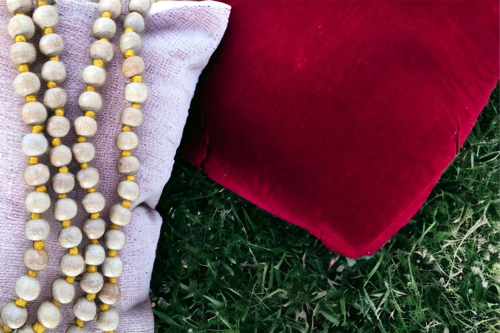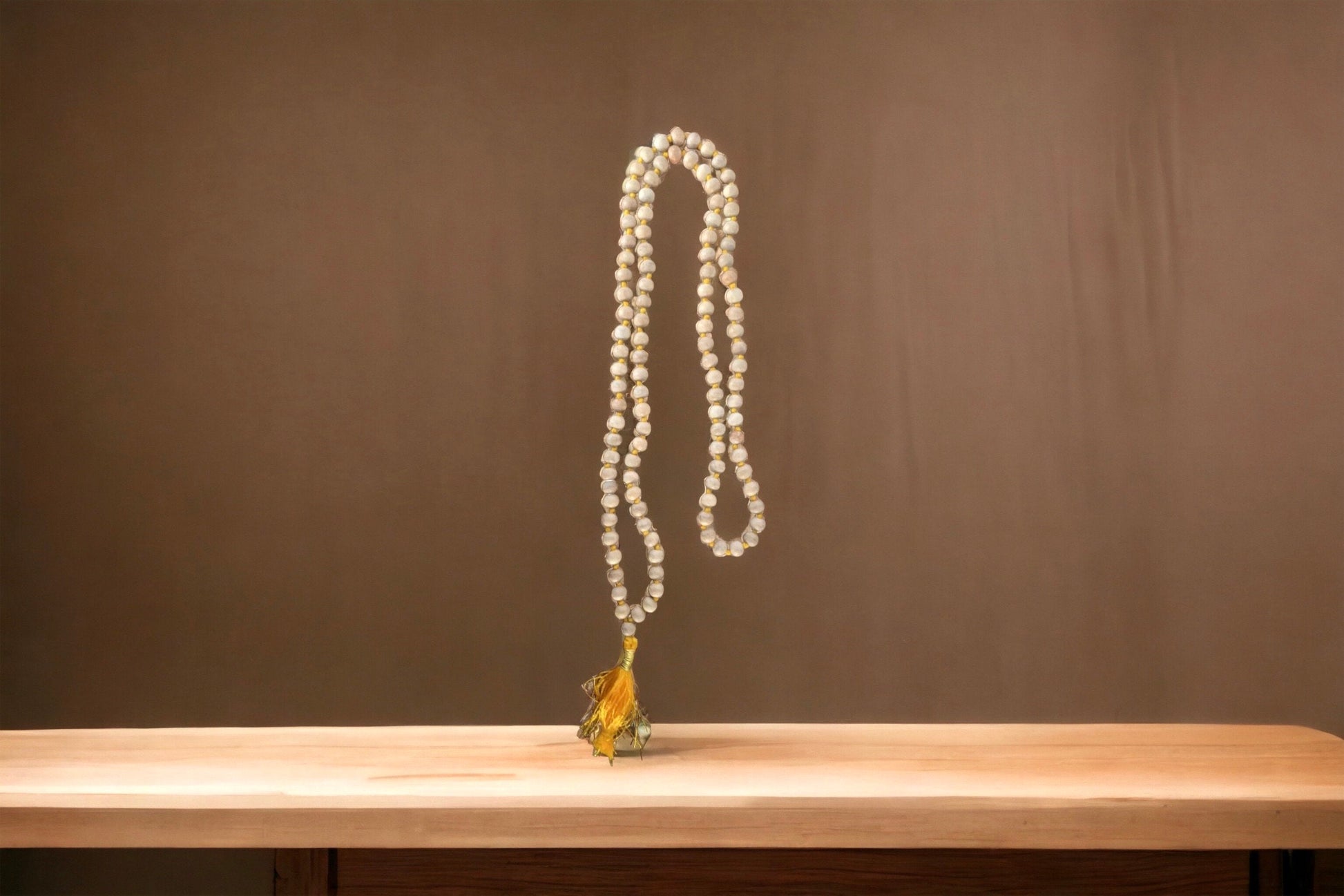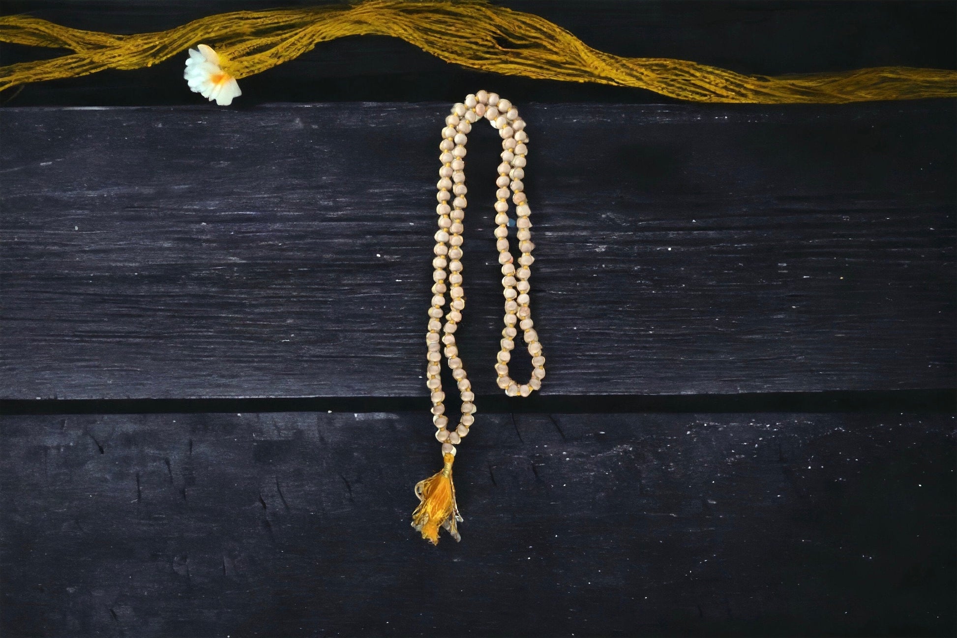 Knotted natural wood prayer bead necklace with golden yellow tassel