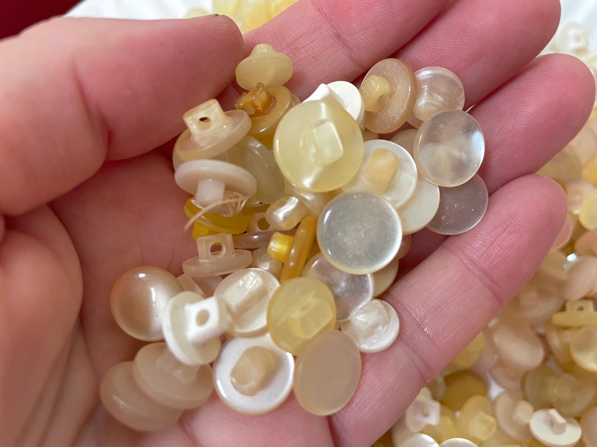 Materials: Durable vintage plastic with a pearlescent finish; most with plastic shanks, some flat back