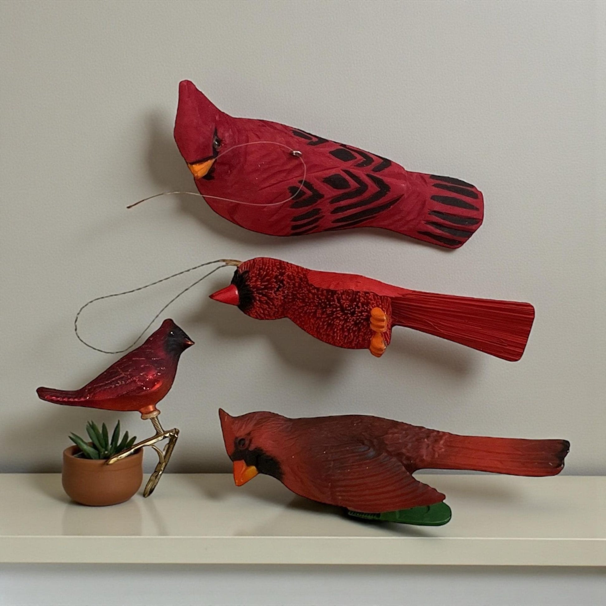 This charming lot of 4 vintage red cardinal Christmas ornaments brings a timeless woodland touch to your holiday décor. Each ornament features the classic bright-red cardinal design—perfect for traditional Christmas trees, nature-themed décor, or collectors of bird ornaments.