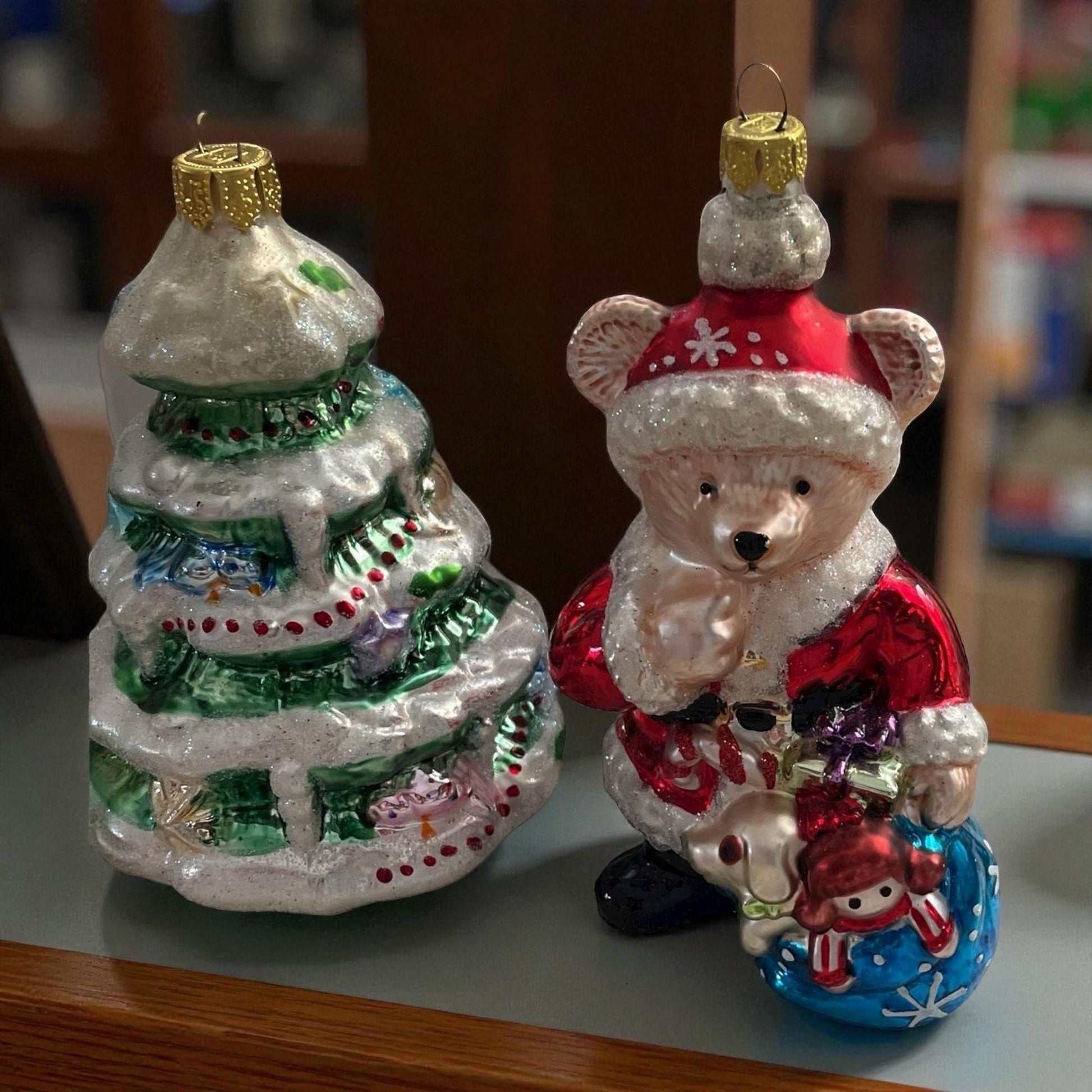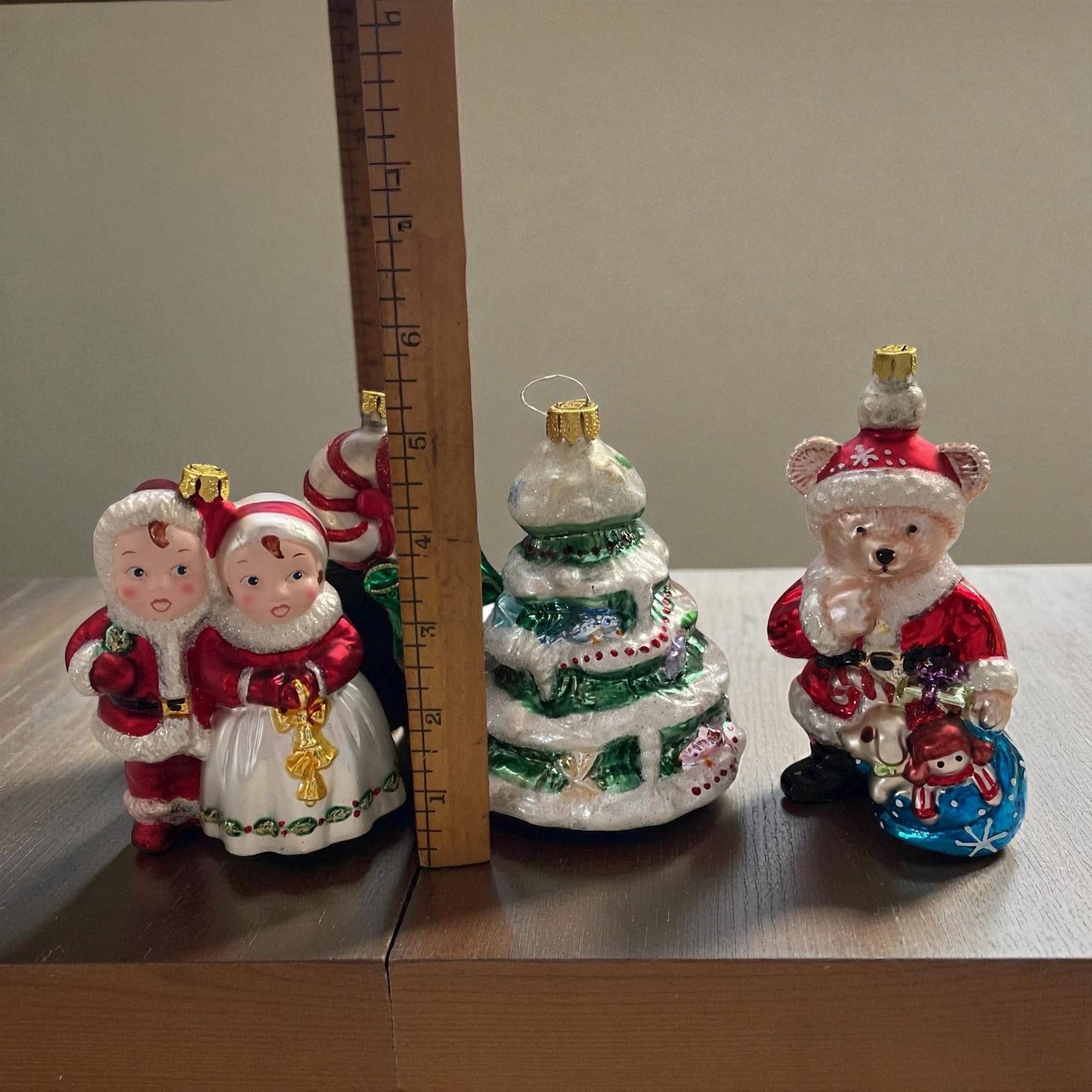 The lot includes 4 unique glass ornaments: Santa & Mrs. Claus, Candy Cane, Christmas Tree, and Bear