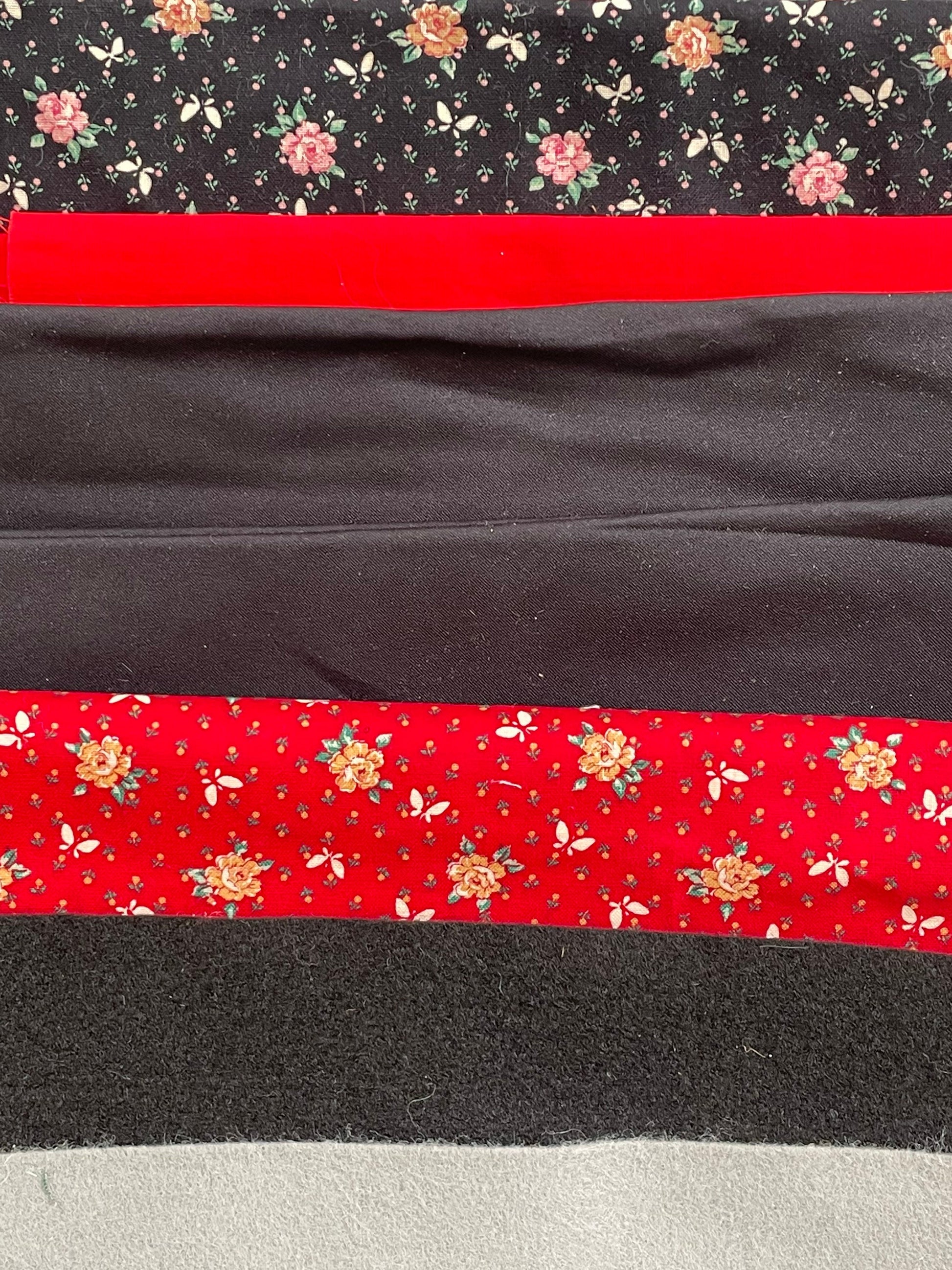 Lot of vintage fabric remnants - reds and blacks, plain and floral