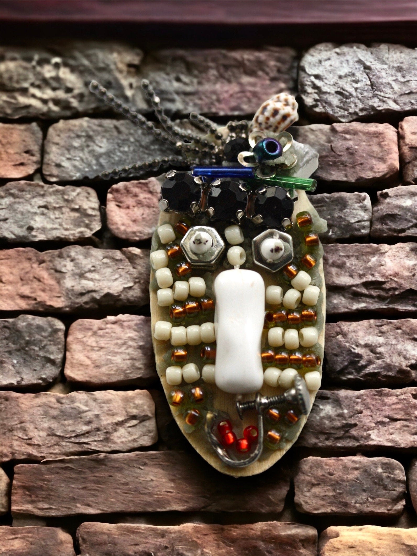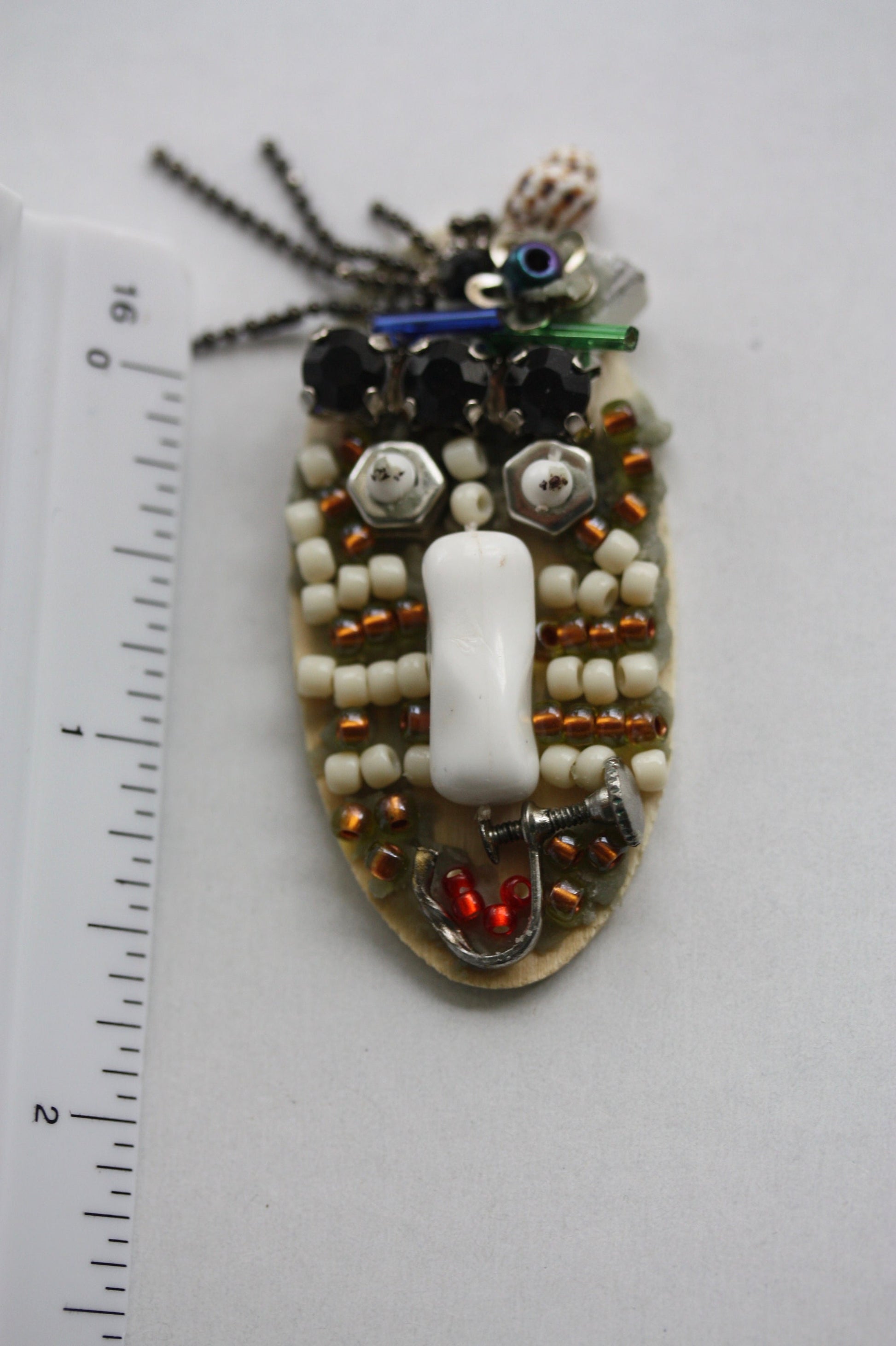 Meet "Sabina." Sabina is a really cool assemblage art gal who can be transformed into a necklace, pin or magnet