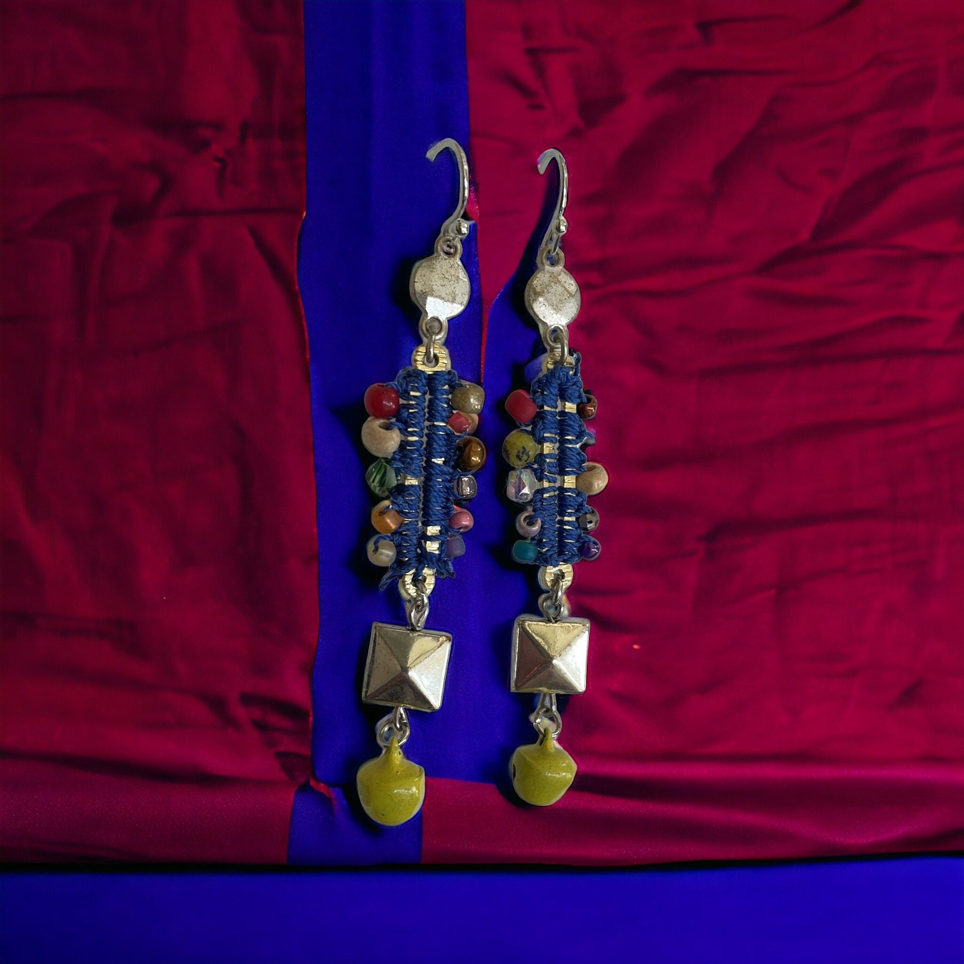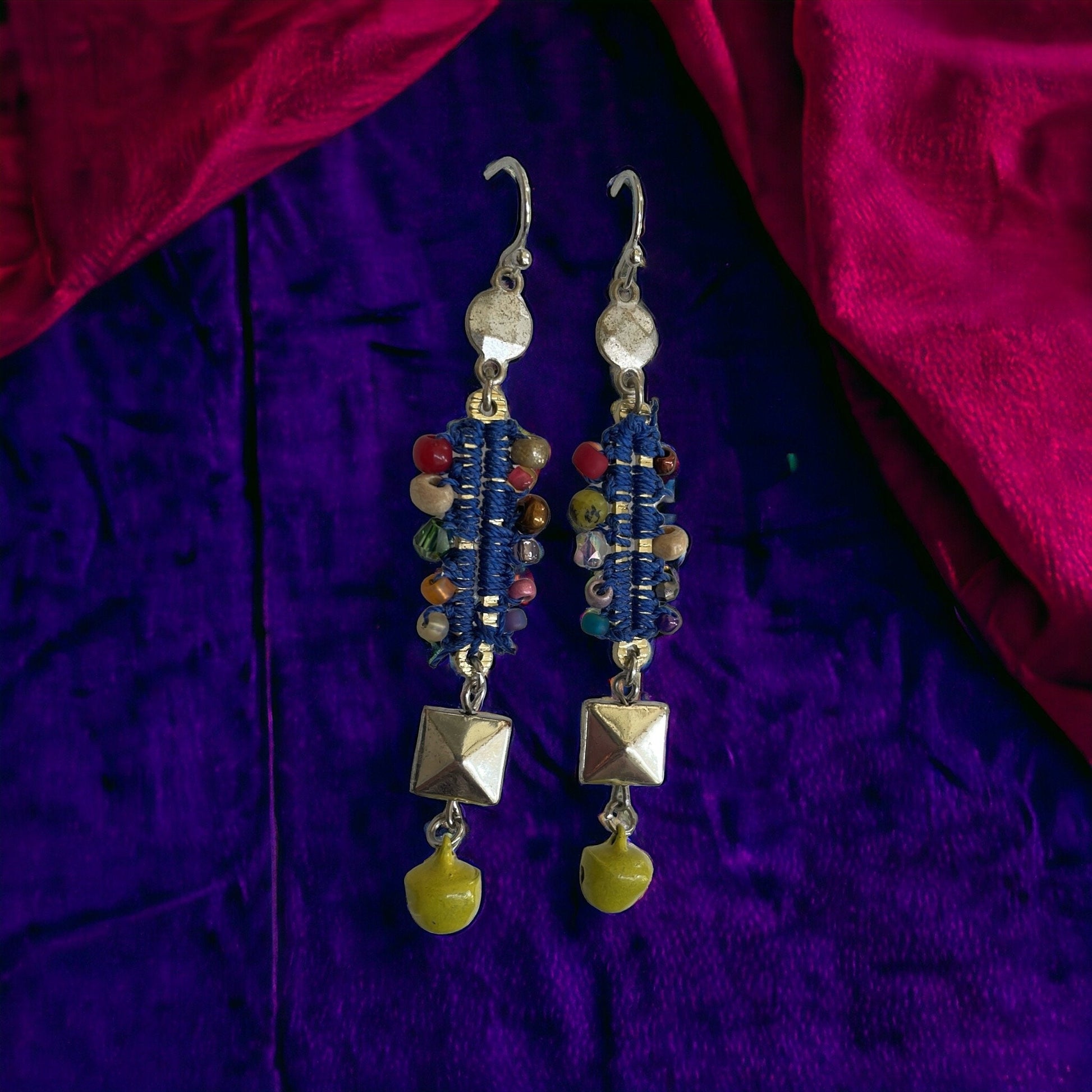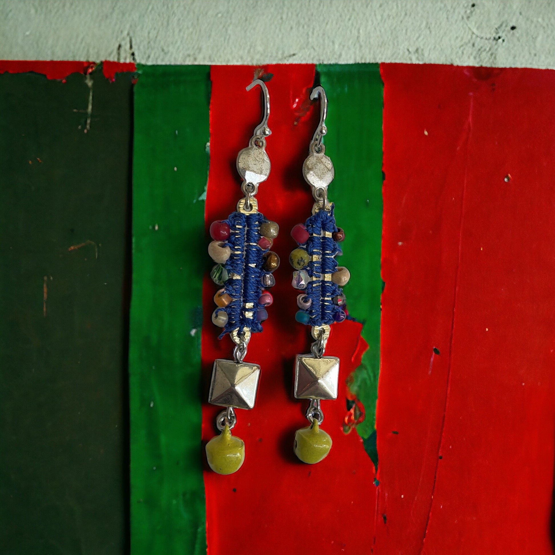 Mixed material collage earrings - metal, string, glass, and mustard yellow tiny bells.