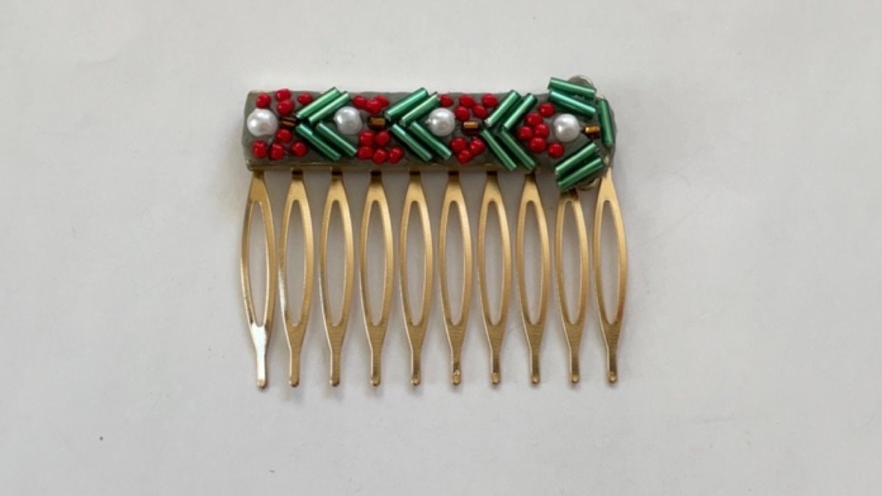 Mixed Material Mosaic Christmas themed metal hair comb - micro mosaic / collage / Assemblage art / Millefiori