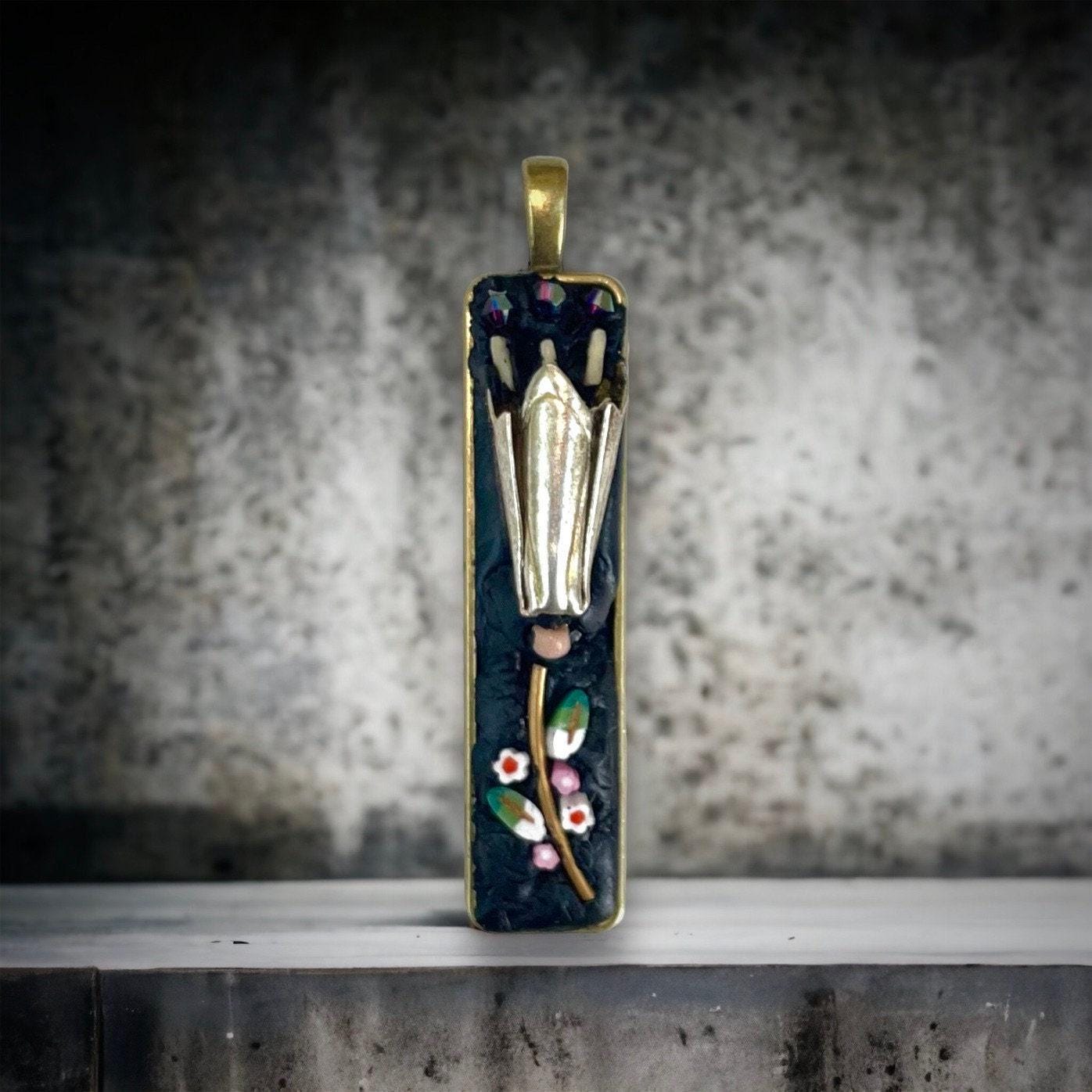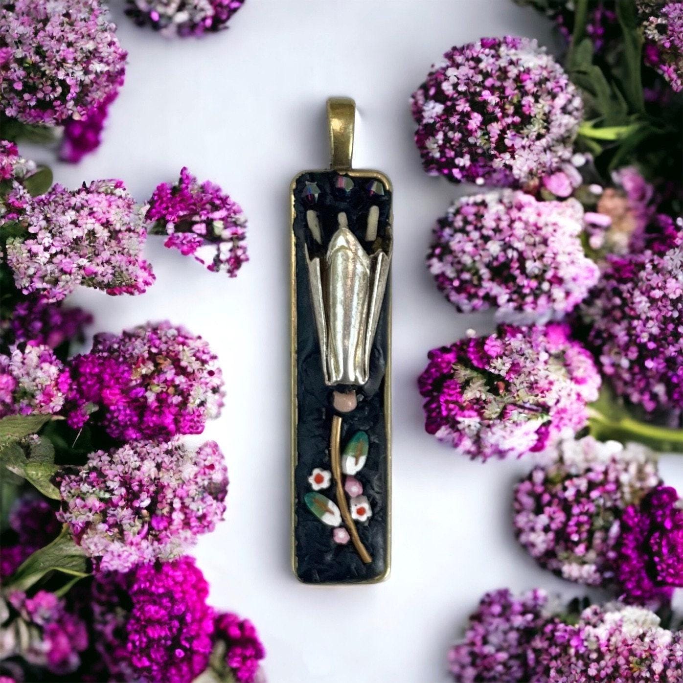Discover the charm of this handmade mosaic necklace, where floral metal pendant artistry meets the delicate beauty of hand cut glass art and Italian millefiori techniques. Each piece is thoughtfully crafted to create a unique assemblage art statement that captures light and color beautifully. This mixed material design brings together intricate micro mosaic details and sparkling Swarovski crystals for a truly one-of-a-kind accessory.
