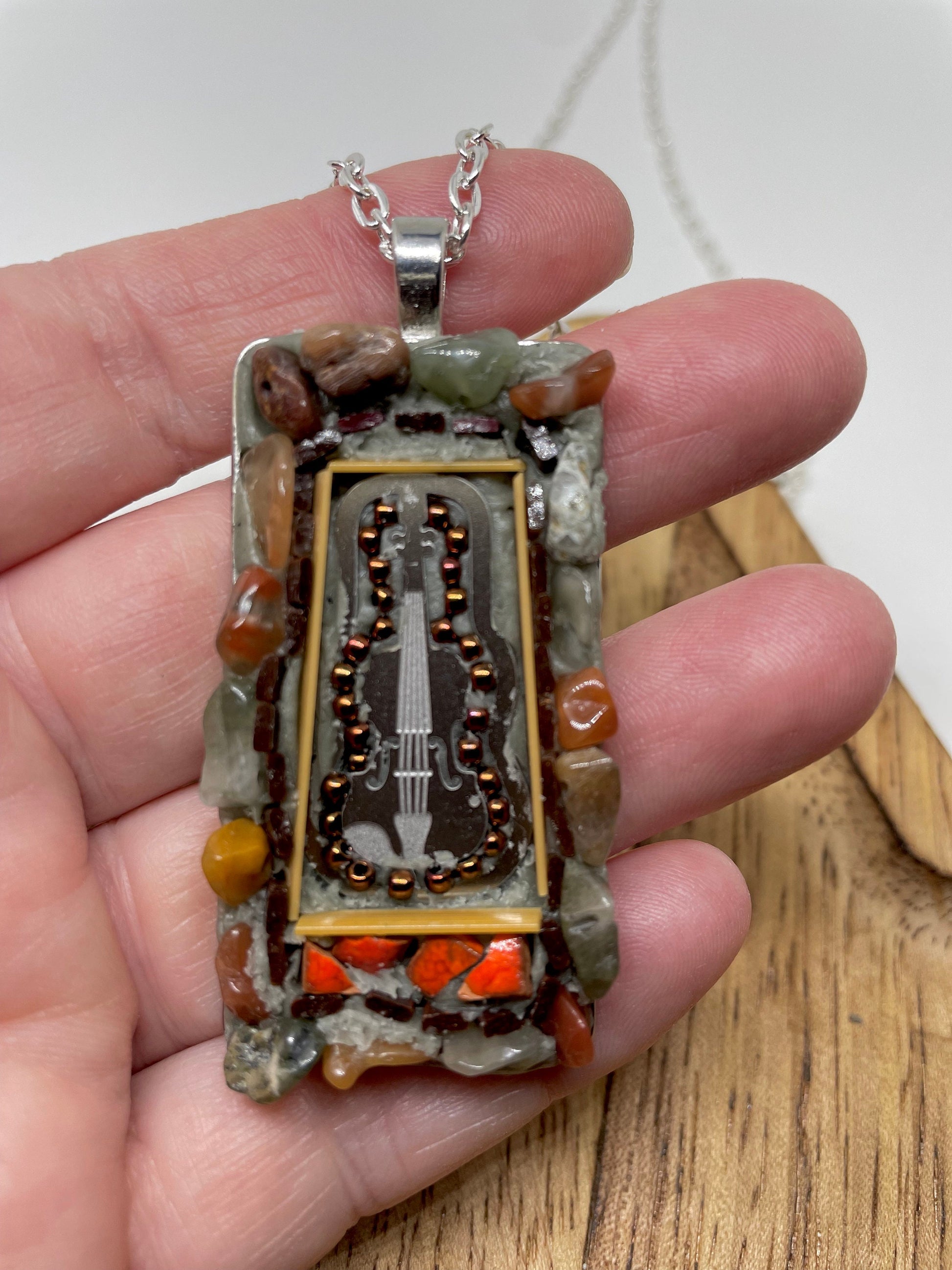 My favorite guitar - one-of-a-kind micro mosaic necklace with mixed material including stone, metal, hand cut tile and strips of glass