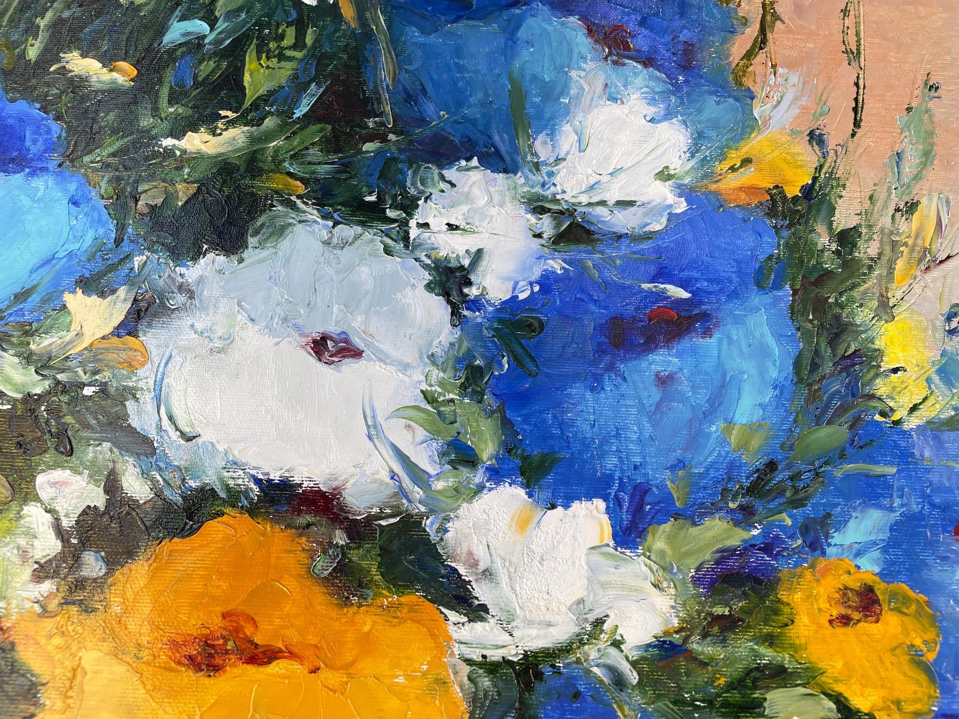 Thick, sculptural paint strokes give the surface a highly tactile quality, allowing the flowers to emerge organically from the canvas rather than appearing flat or formal. The texture catches the light beautifully and adds dimension that can only be appreciated in an original artwork.