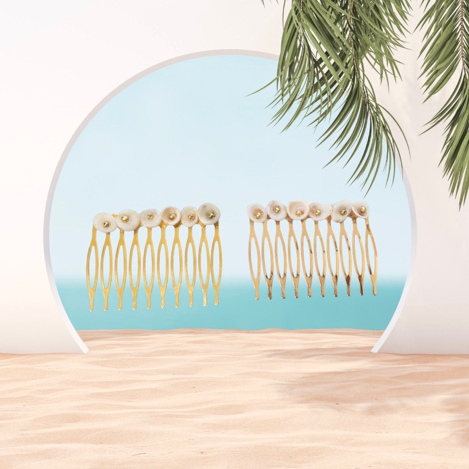 These hair combs feature beautiful tiny little shells. They are creamy white (like an ivory color) and I've trimmed them with goldtone seed bead centers. Each little shell is unique, as you can see, due to the natural nature of shells.