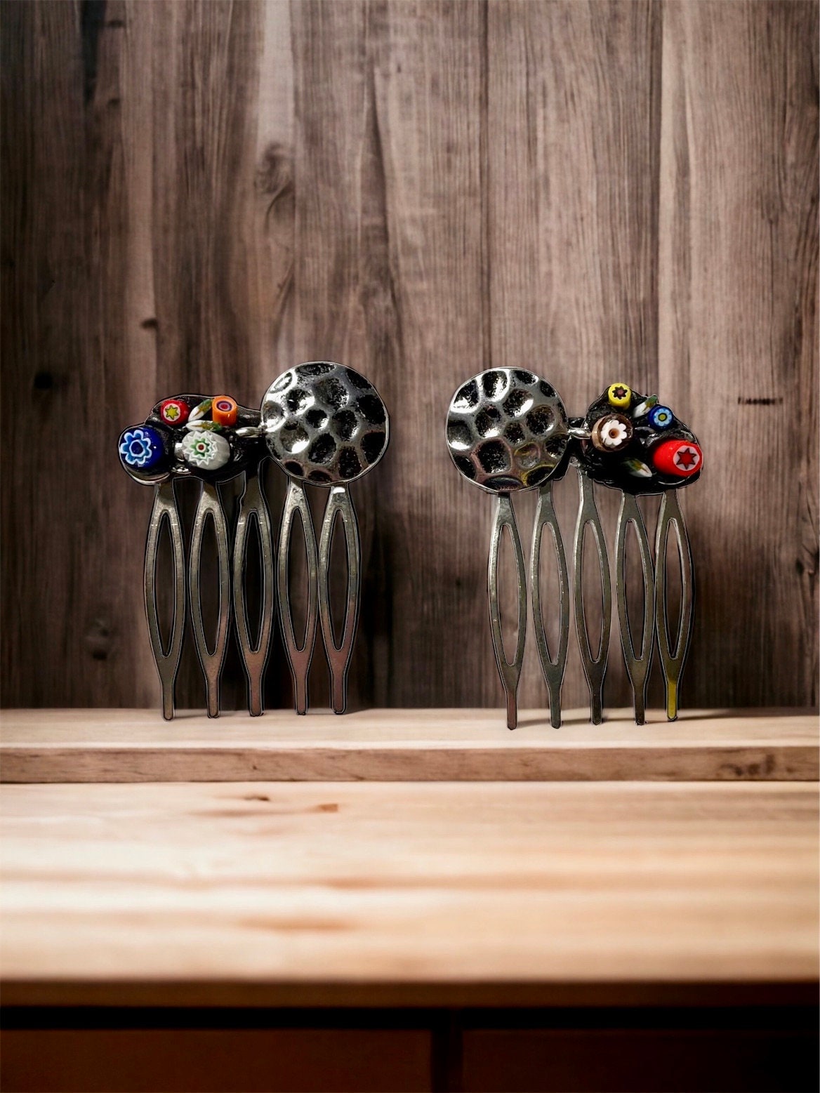 Pair of one-of-a-kind handmade Italian glass micro mosaic hair combs with millefiori