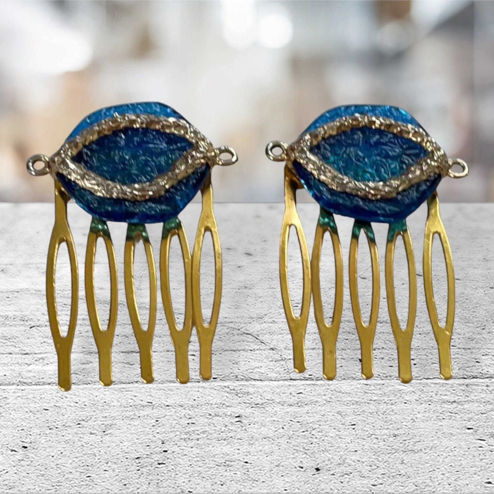 Pair of upcycled mixed material blue and gold small hair combs - 1" each - inspired by Mid Century Modern MCM design