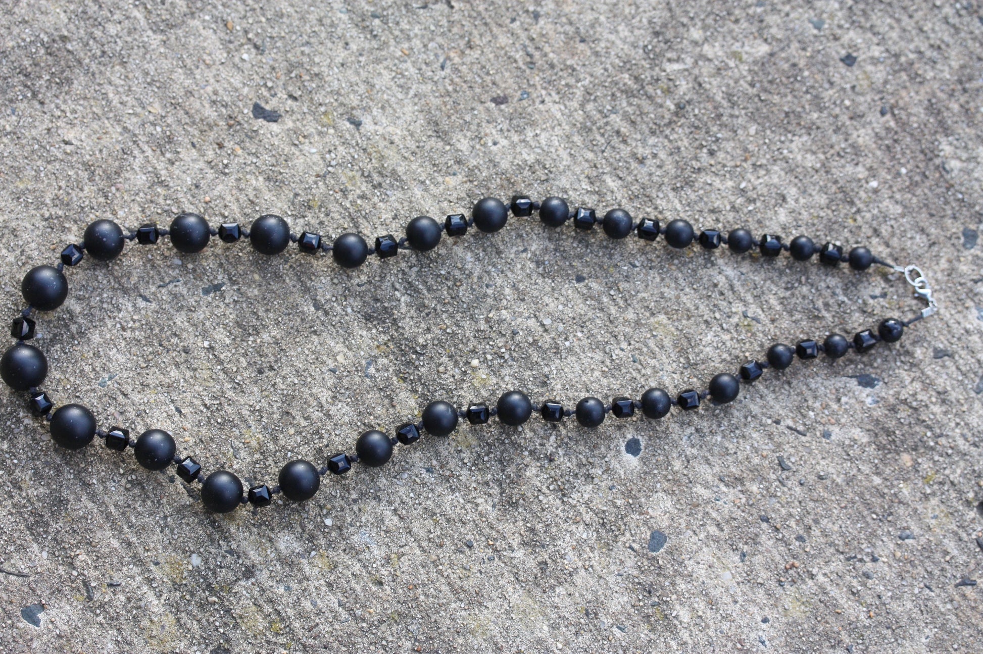 Stunning, high quality long black vintage necklace - with black matte round faux pearls and smooth cubed black crystal-like beads