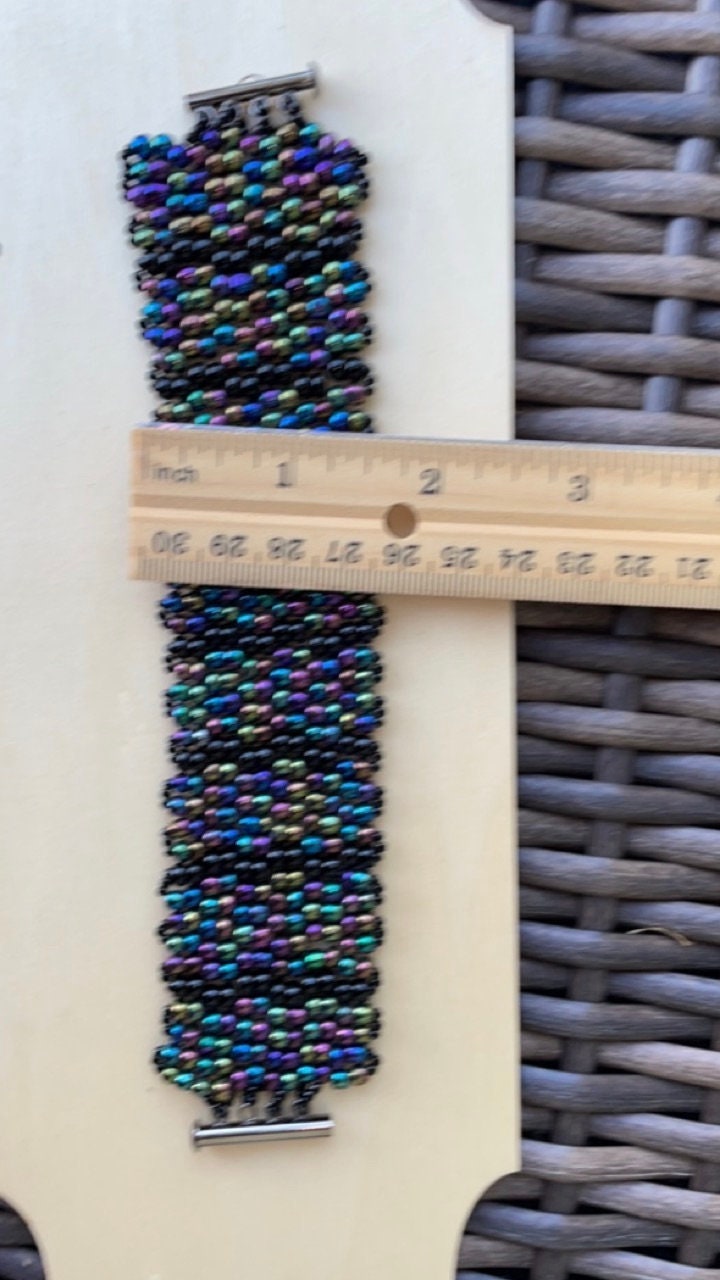 This stunning vintage beadwork bracelet features black and iridescent glass seed beads. Each of the many little seed beads was hand sewn to create this magnificent bracelet.
