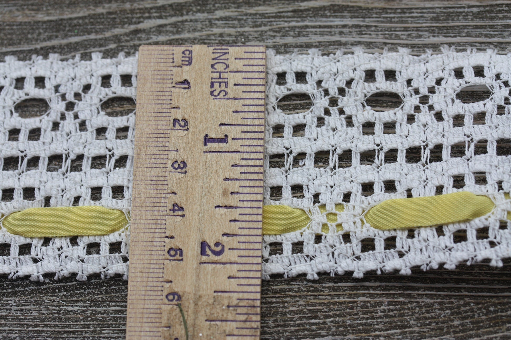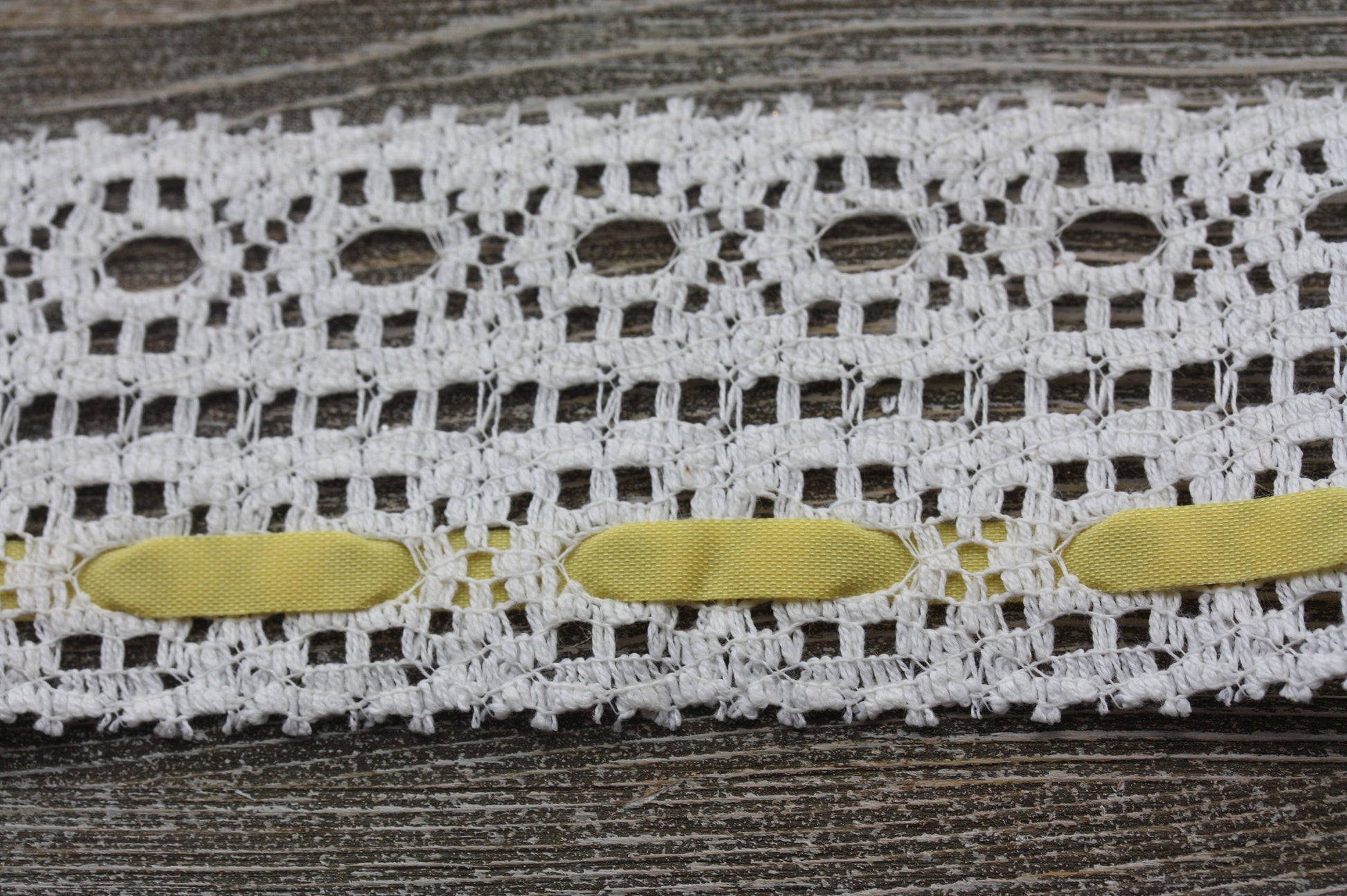 Stunning wide vintage white lace with yellow ribbon - by the yard