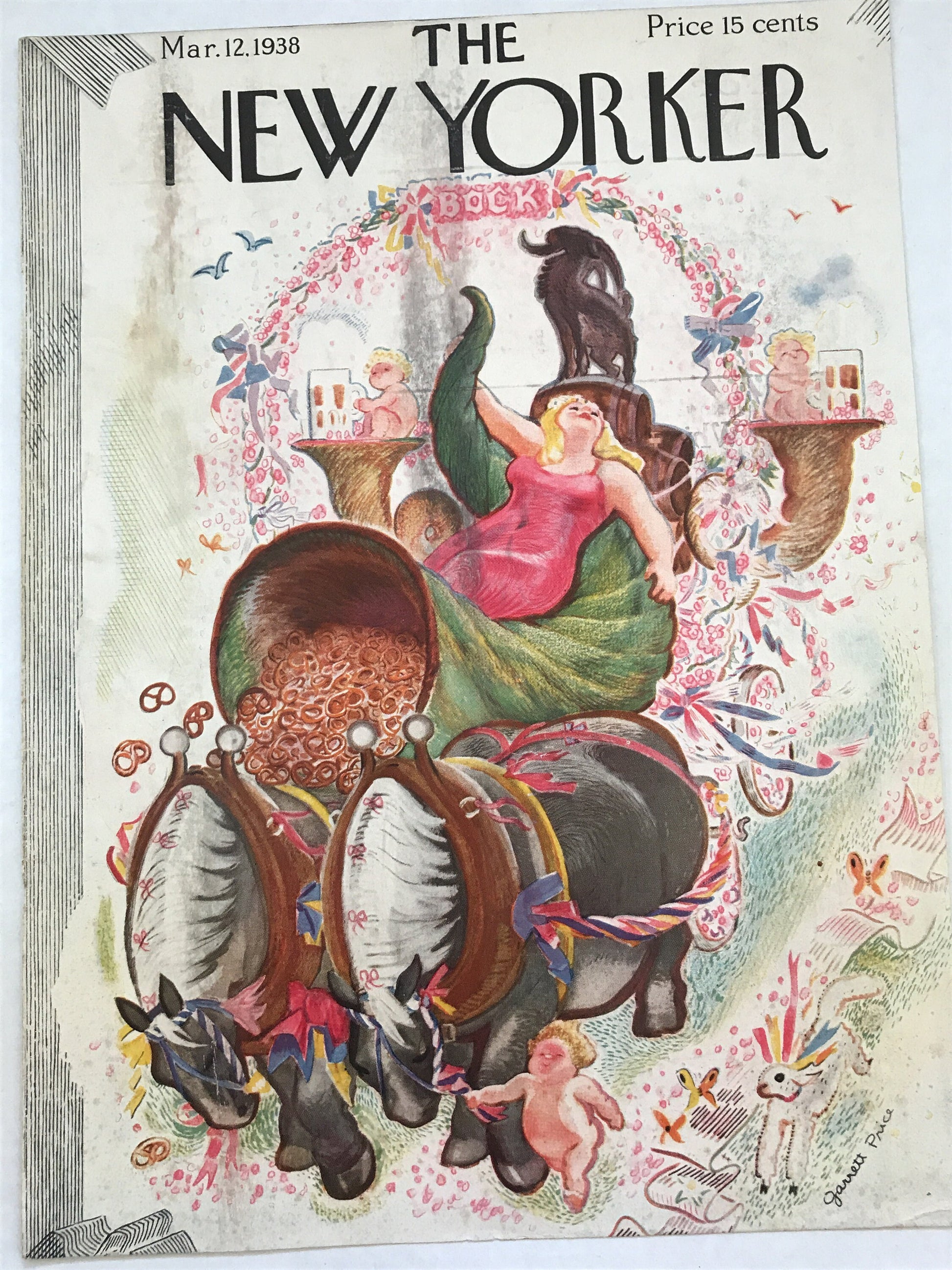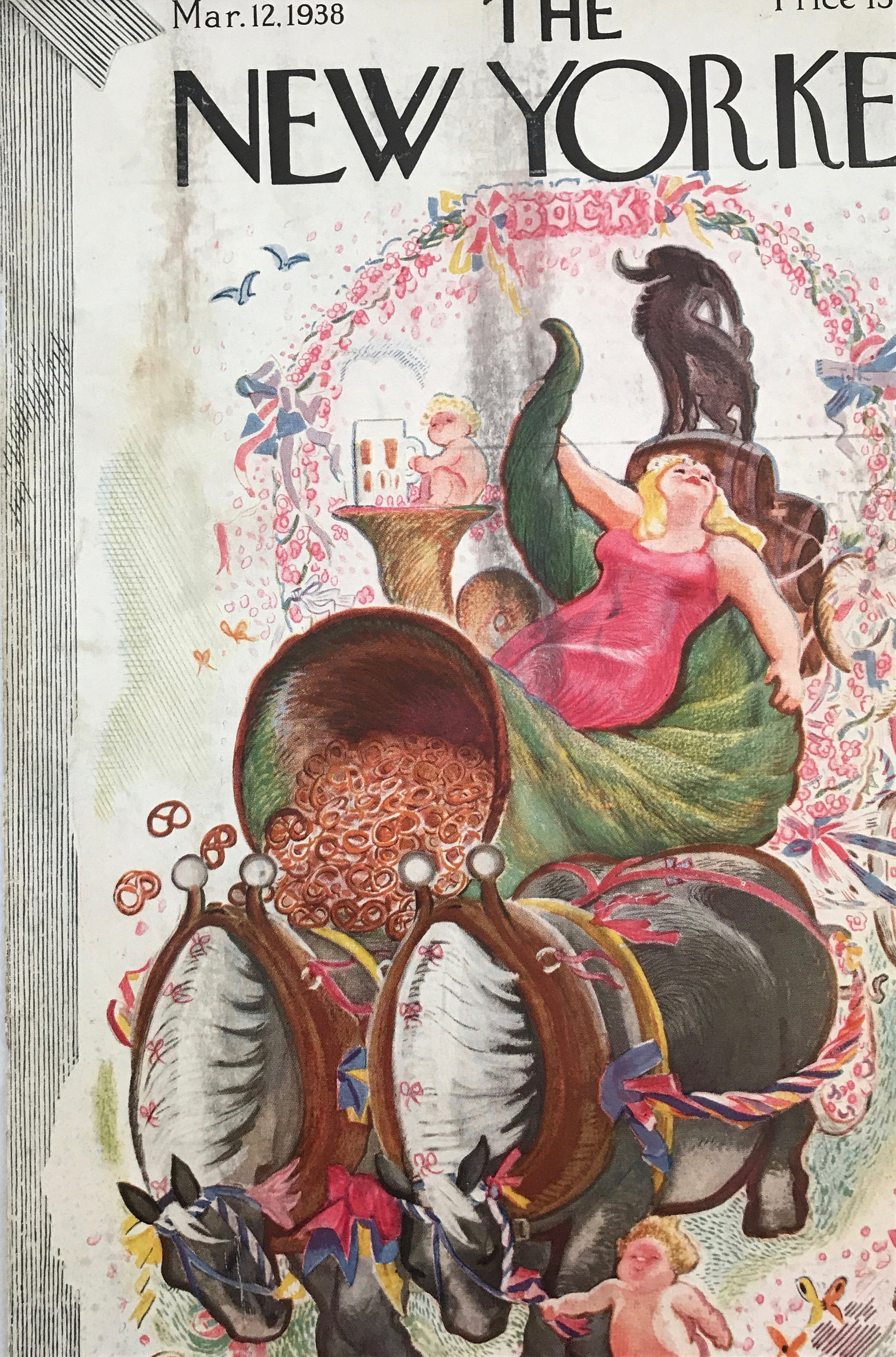 The NEW YORKER Magazine very rare original cover - March 12, 1938 - Garrett Price - Woman on float with beer and cornucopia of pretzels