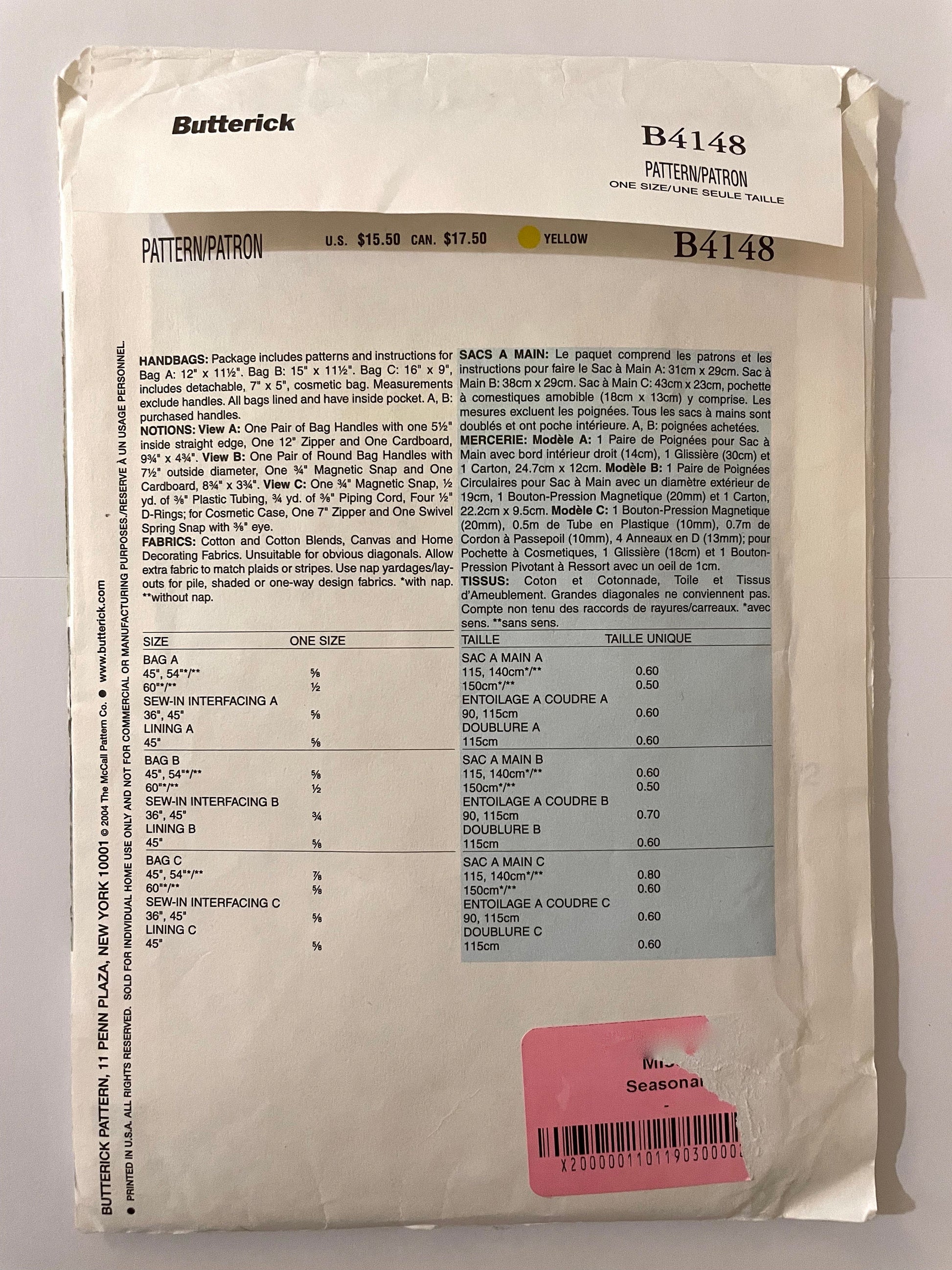 UNCUT Sewing Pattern - Butterick B4148 Handbags sewing pattern