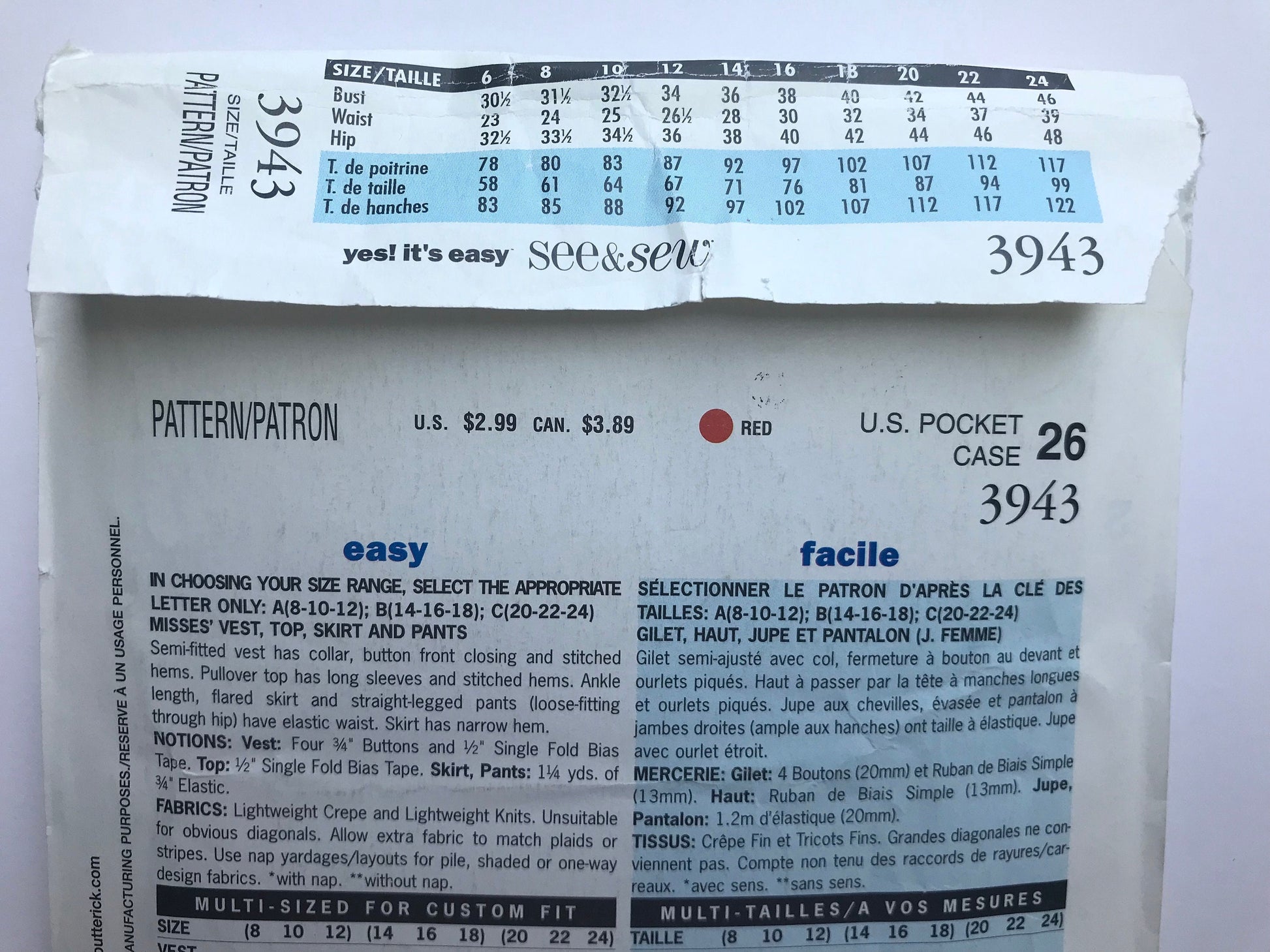 UNCUT Sewing Pattern - Butterick See & Sew 3943, Sizes 6 - 24, Easy Pants, Shirt, Vest and Long Skirt