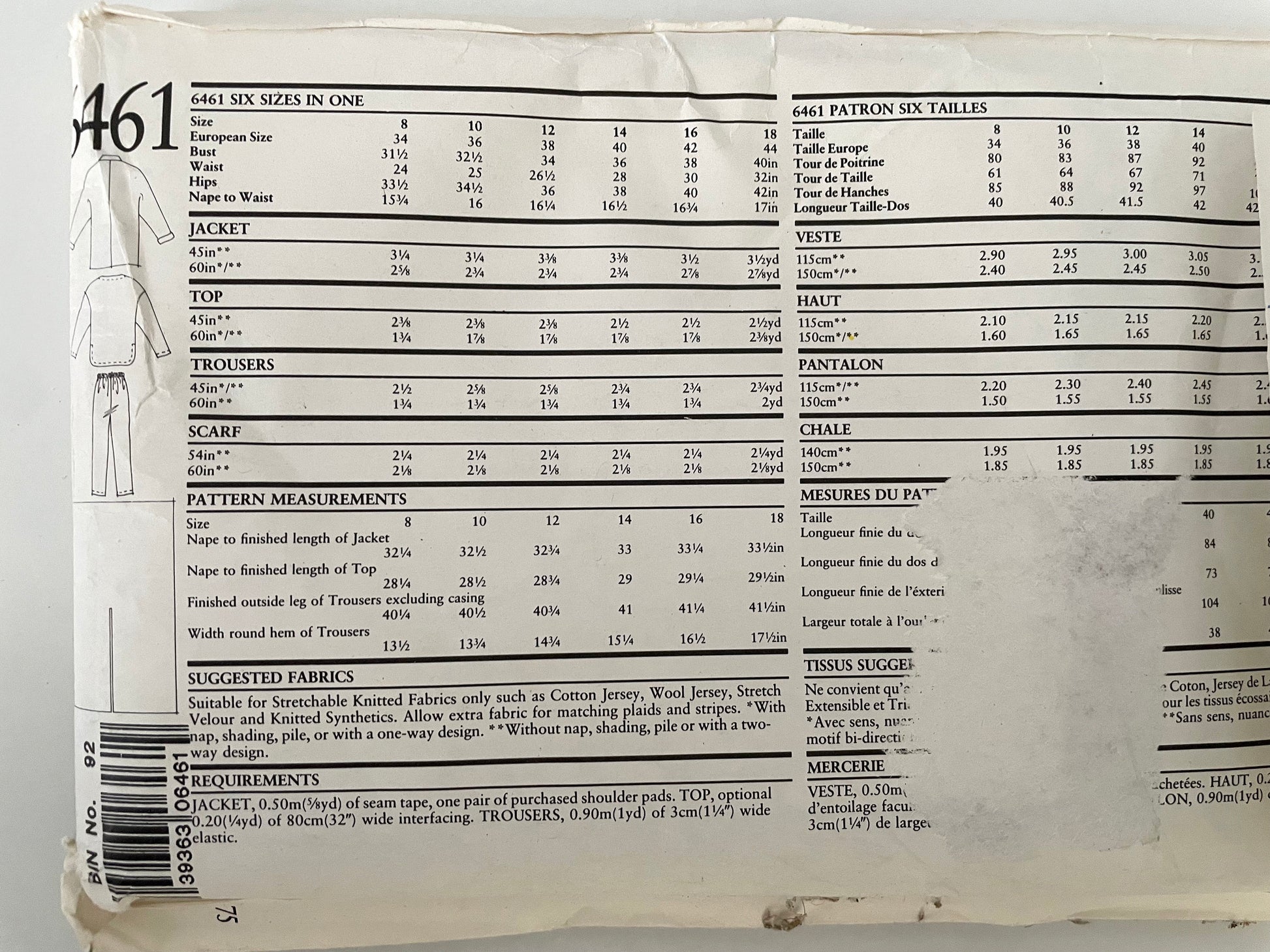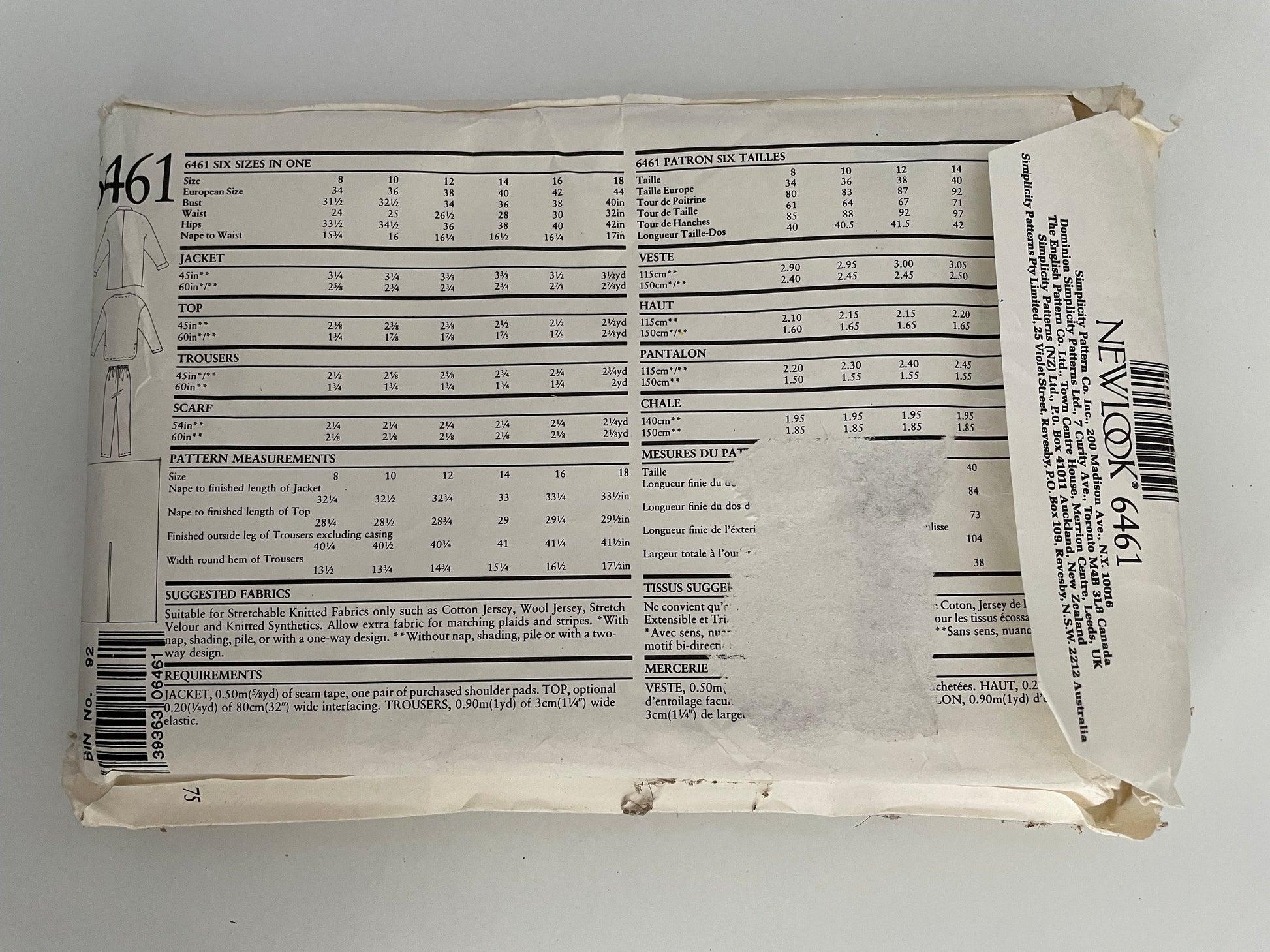 UNCUT Sewing Pattern - New Look sewing Pattern 6461 - Sizes 8 - Jacket Top Trousers Scarf 4 Stretch Knit Comfy