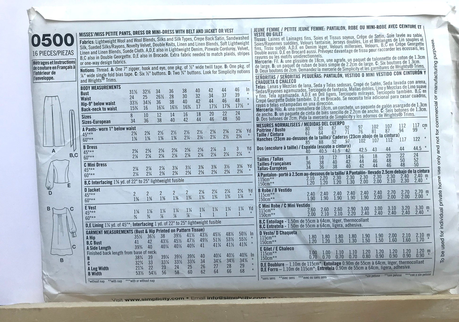 UNCUT Sewing Pattern - Simplicity 0500, Pants, Dress, or Mini Dress with Belt and Jacket or Vest, Sizes 8 - 16