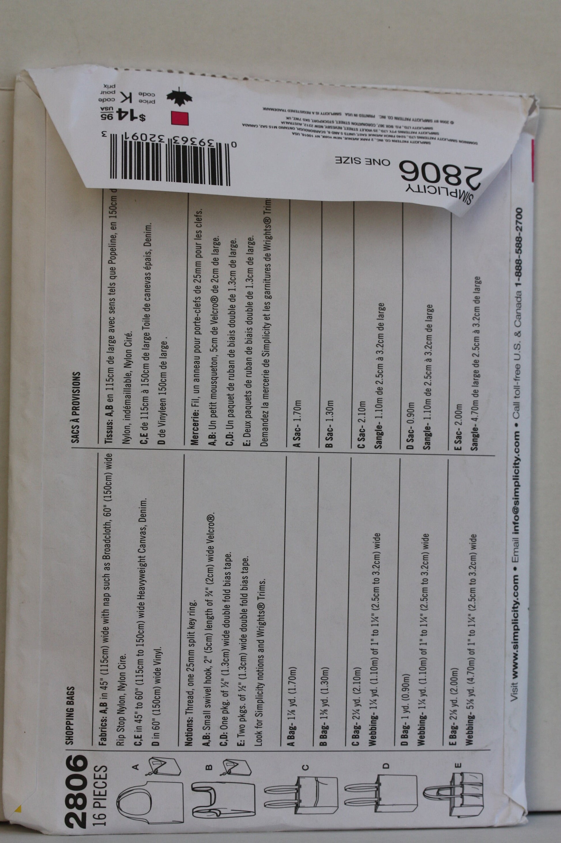 UNCUT Sewing Pattern - Simplicity Craft Shopping & Garden Bag sewing pattern #2806