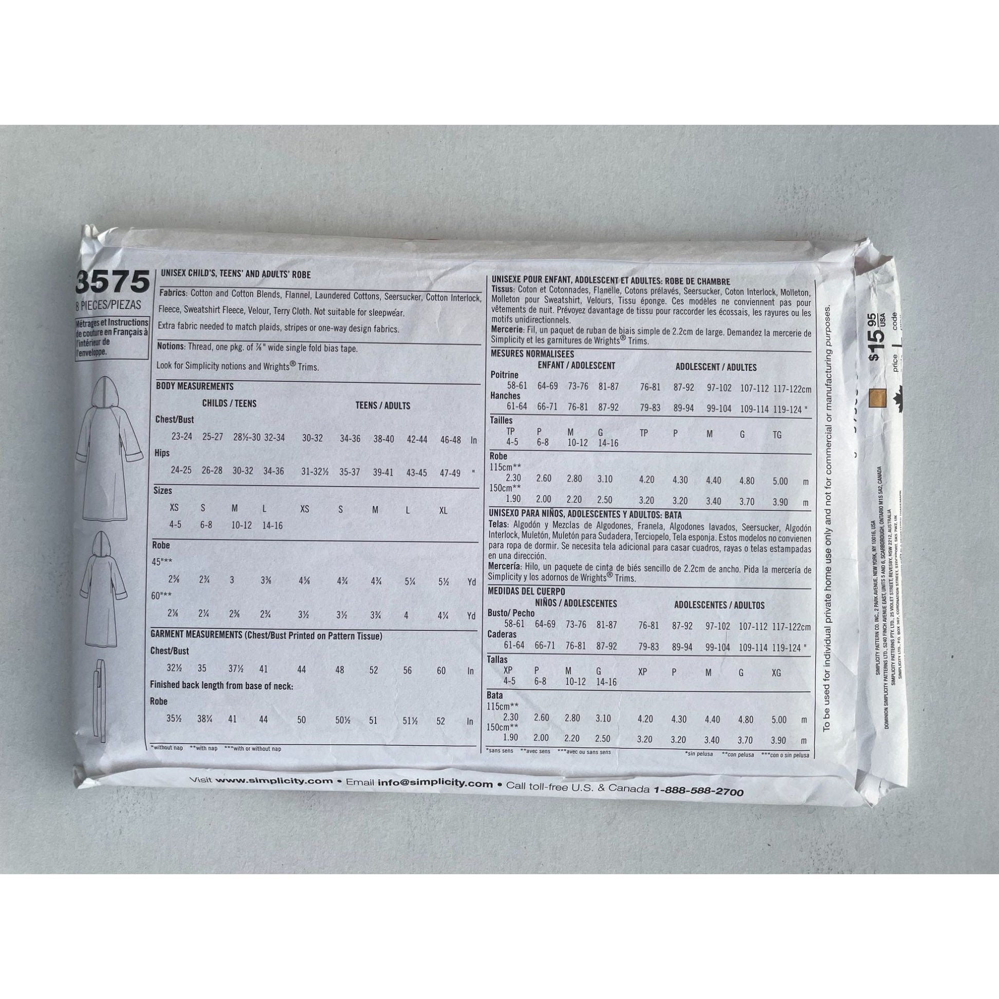 UNCUT Sewing Pattern - Simplicity Pattern 3575 Family Bathrobes, Kids to Adult Size XS to XL