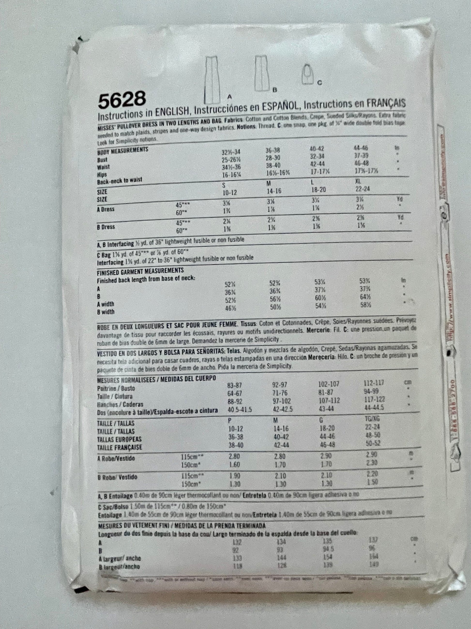 UNCUT Sewing Pattern - Simplicity Pattern 5628 Misses Pullover Dress in Two Lengths, and Bag - Size Small, Medium, Large, XLarge