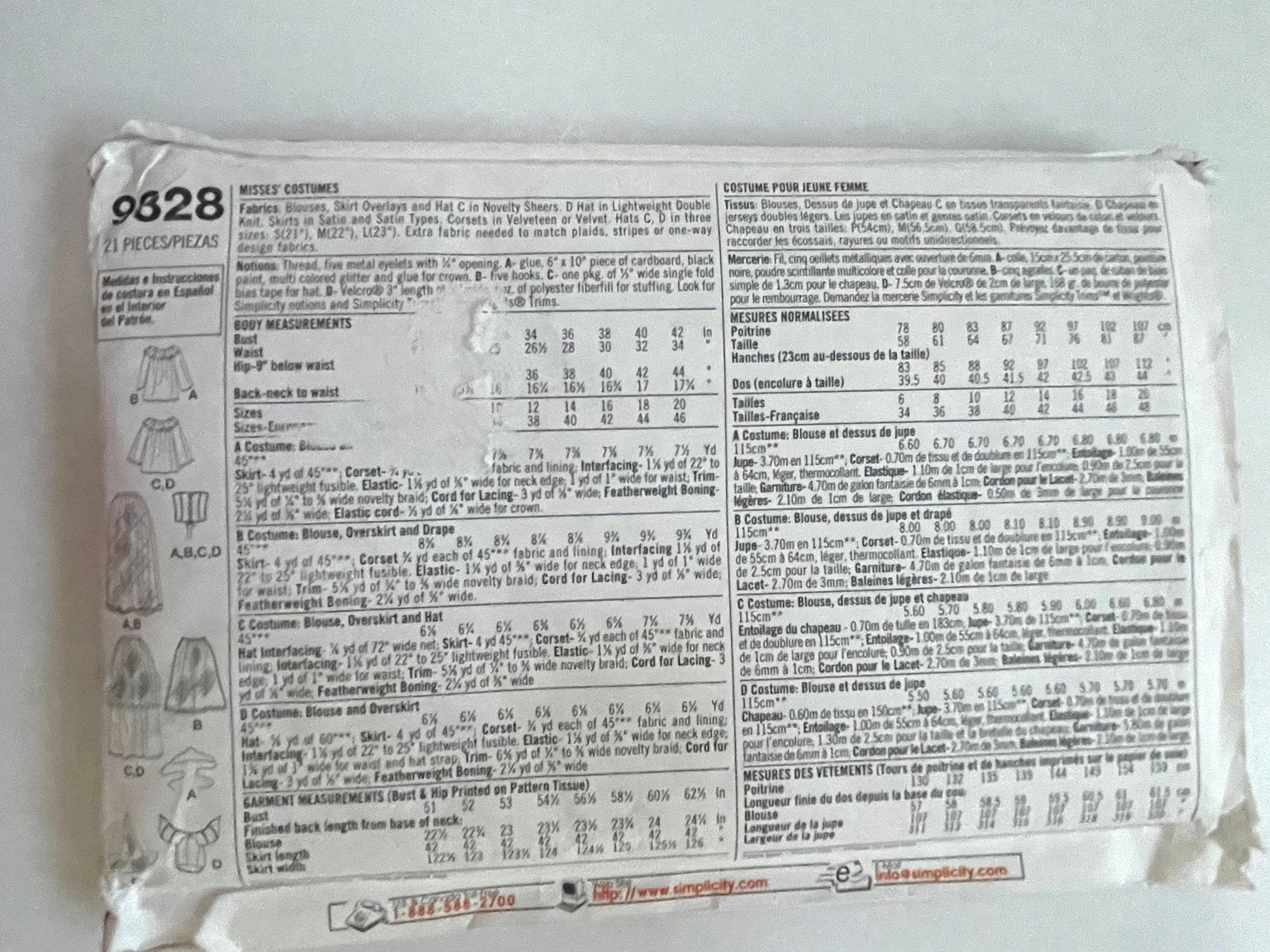 UNCUT Sewing Pattern - Simplicity Sewing Pattern 9828 Sz HH 6-12 ~ Misses' costumes - blouse, overskirt, drape, hat ~ witch, vampire