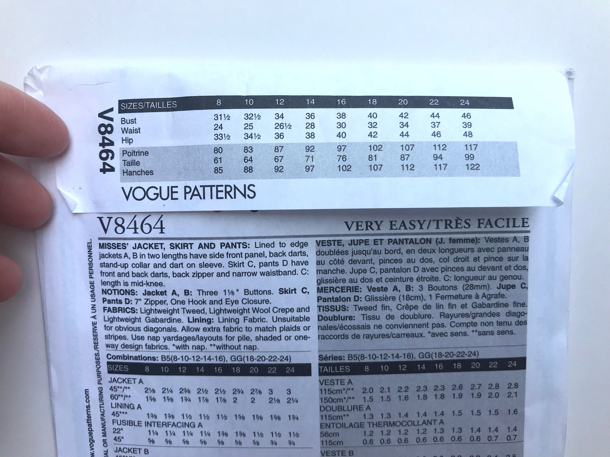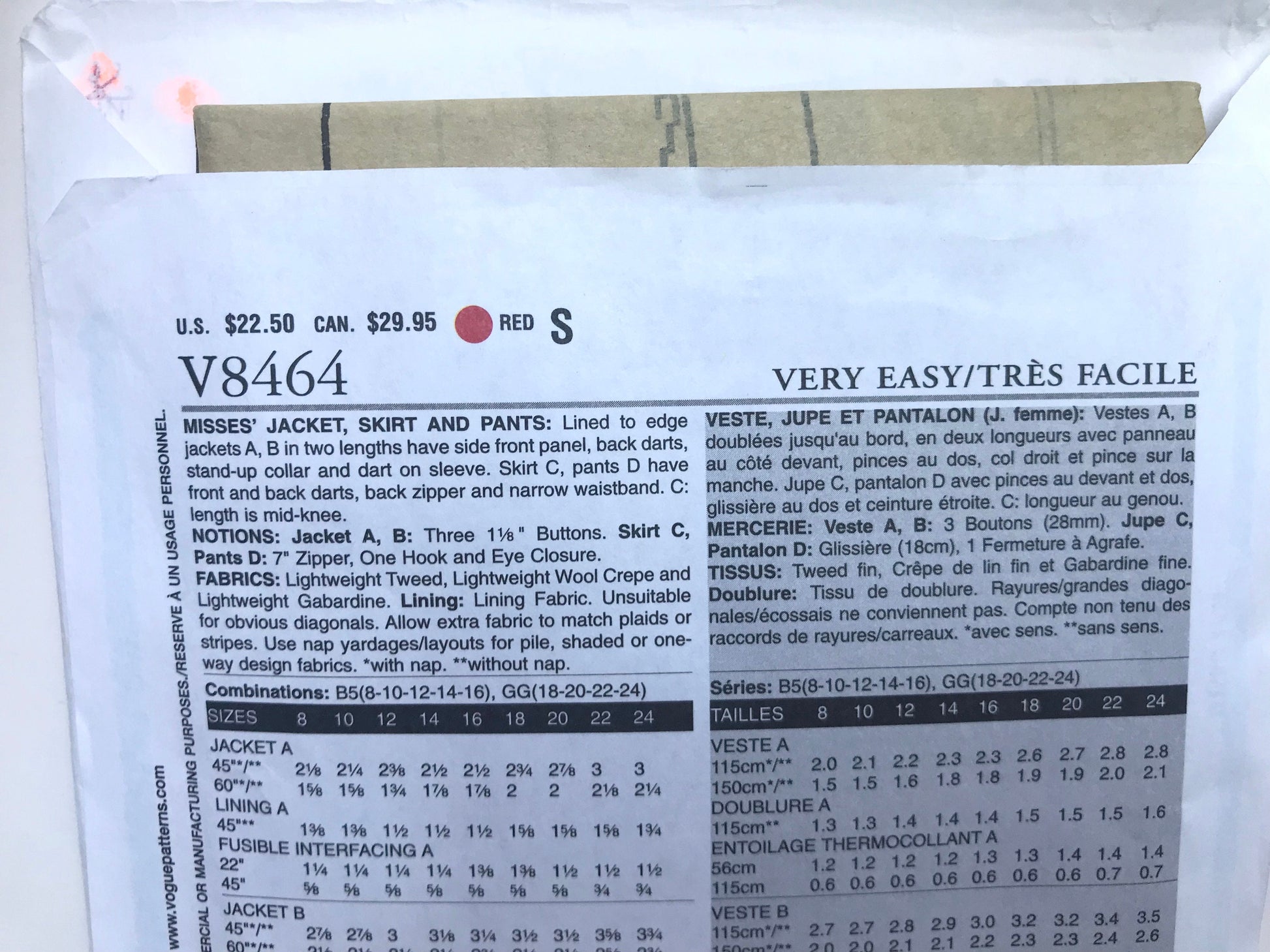 UNCUT Sewing Pattern - Very Easy Vogue 8464 (V8464) Sizes 18, 20, 22, 24 - Jacket, Pants and Skirt
