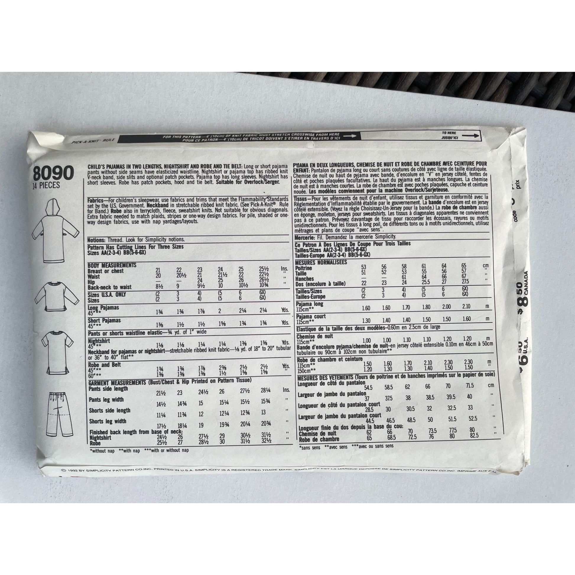 UNCUT Sewing Pattern - Vintage Simplicity 8090 Kids Sewing Pattern,Child's Pajamas, Night Shirt, and Robe,Vintage 1992, Childs' Size 5-6x