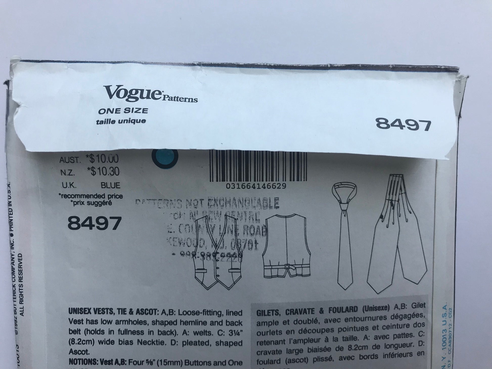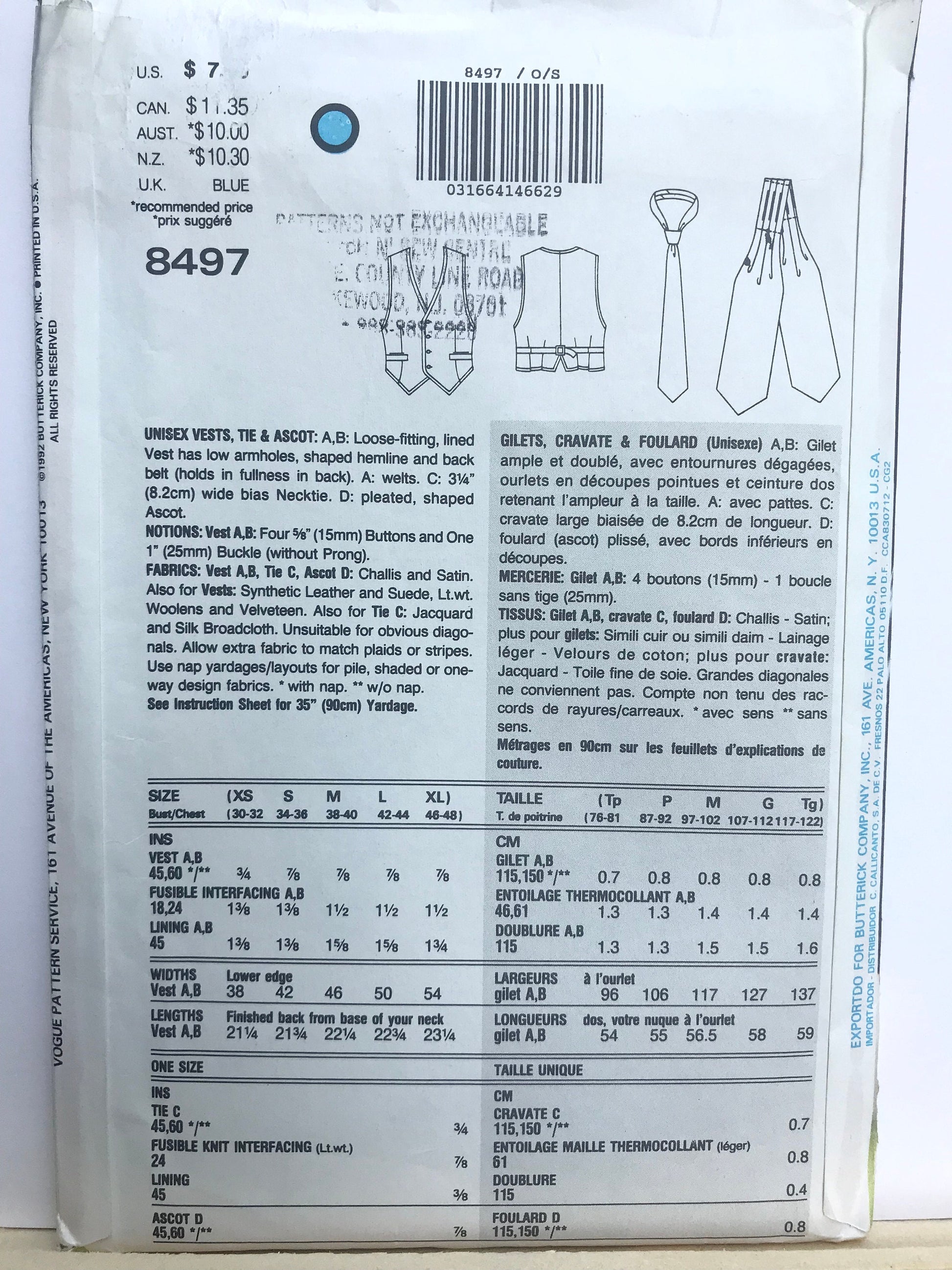 UNCUT Sewing Pattern - Vogue Vest Pattern 8497 - Men's or Misses' Unisex Vest, Tie & Ascot - Very Easy Vogue Accessories - One Size Pattern