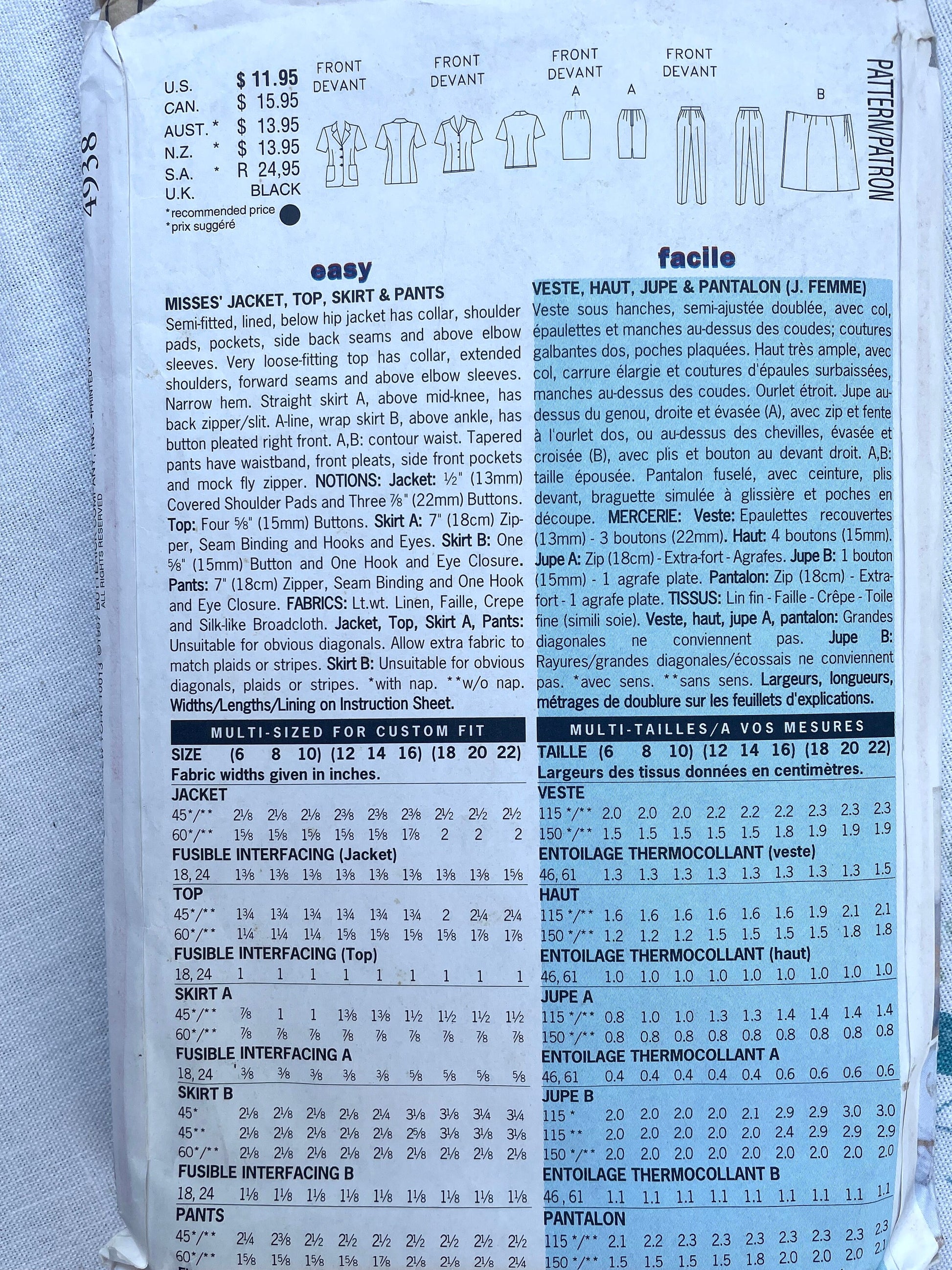 UNCUT Vintage Sewing Pattern - Butterick JG Hook 4938 Misses Jacket Top Skirt Pants - Sizes Tall 6, 8, 10