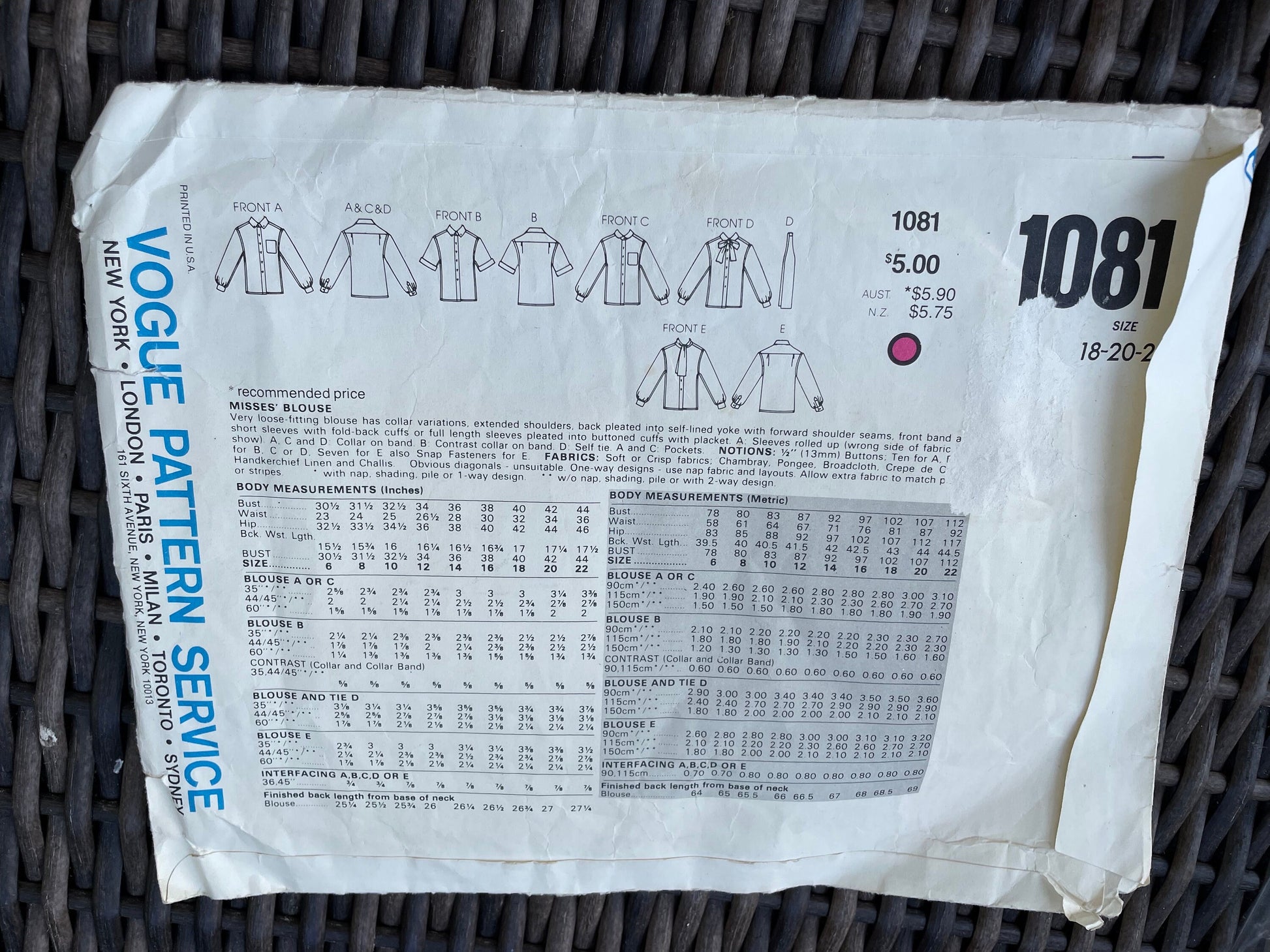UNCUT Vintage Sewing Pattern from 1983 - Vogue's Basic Design 1081 Misses Blouse - Sizes 18, 20, 22