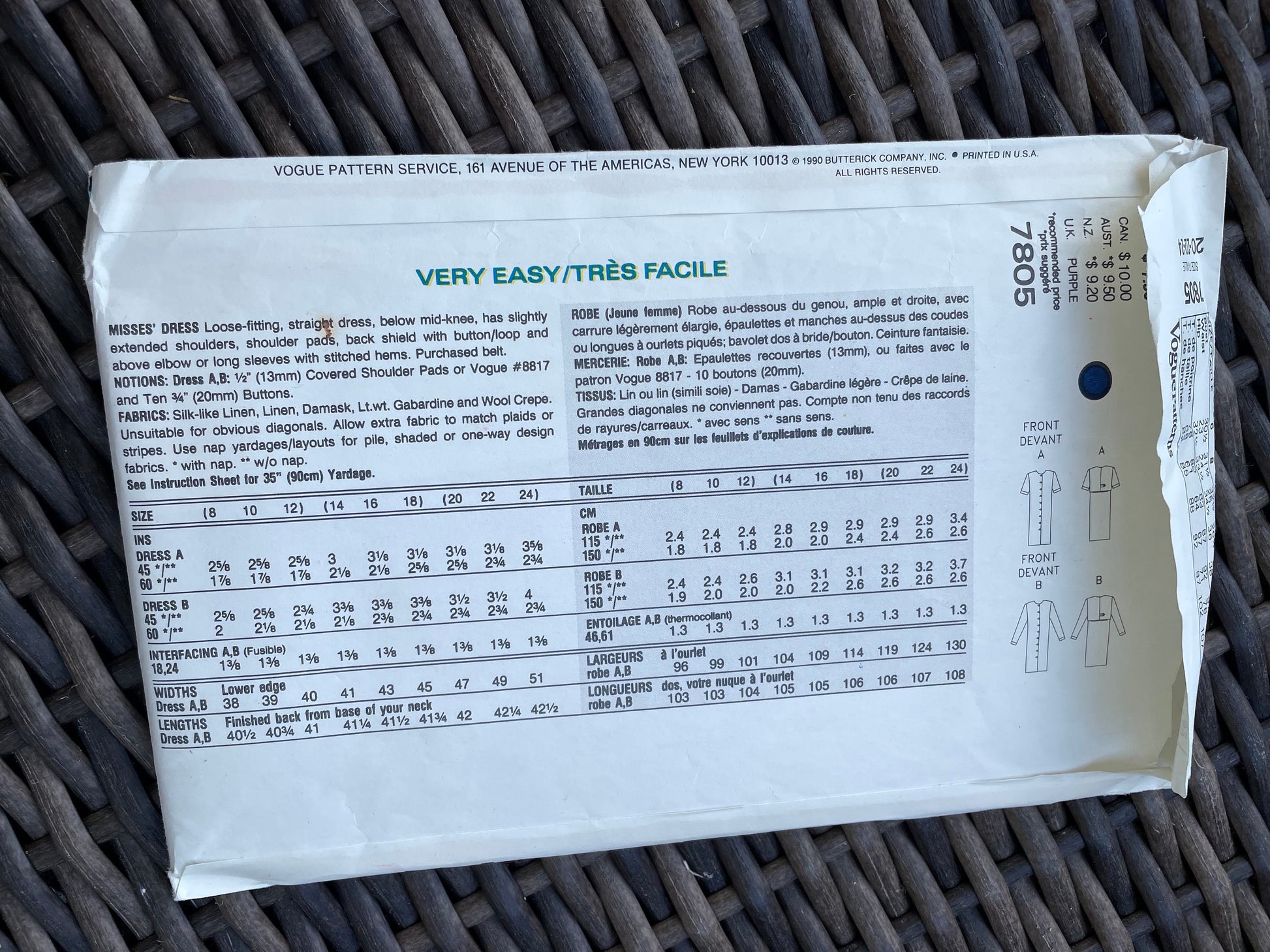 UNCUT Vintage Sewing Pattern from the 1990's - Very Easy Vogue 7805 - Button Front Dress with back overlay - Size 20, 22, 24