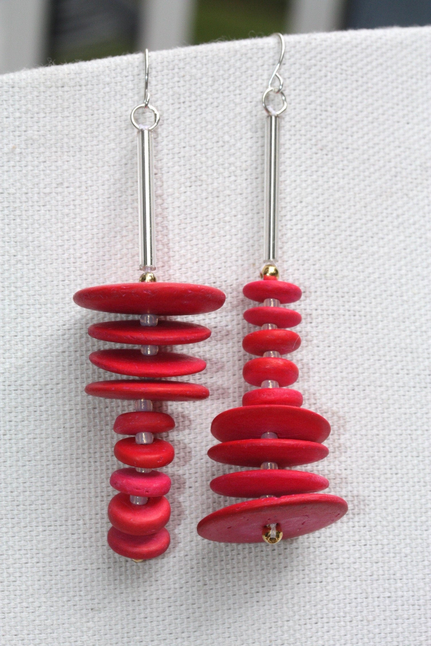 I hand beaded these earrings out of vintage pinkish red wooden heishi beads. I designed them to be fun - with one upside down from the other as shown.