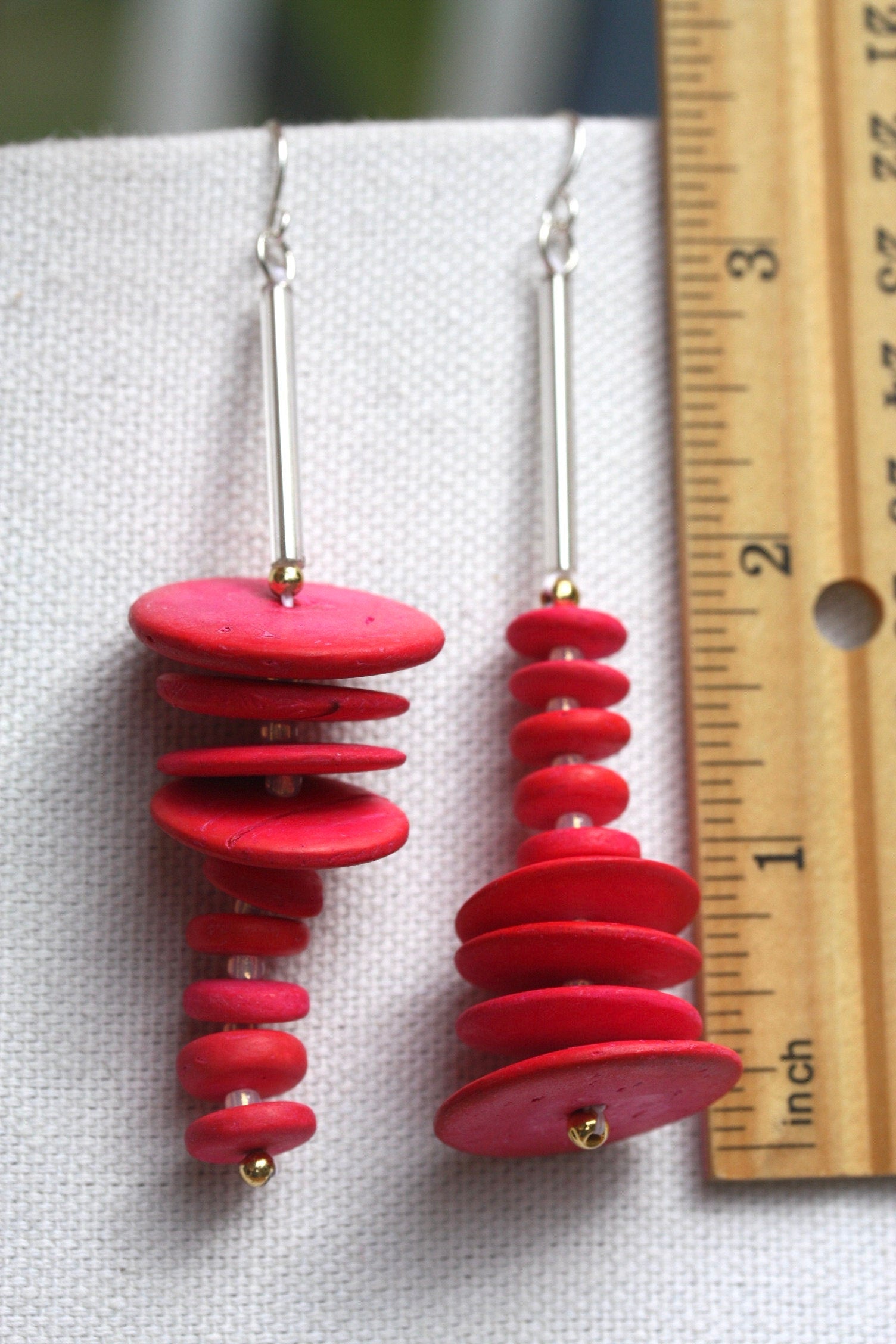 Unique, hand beaded reddish pink wood heishi beads - fun statement earrings