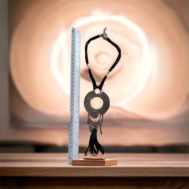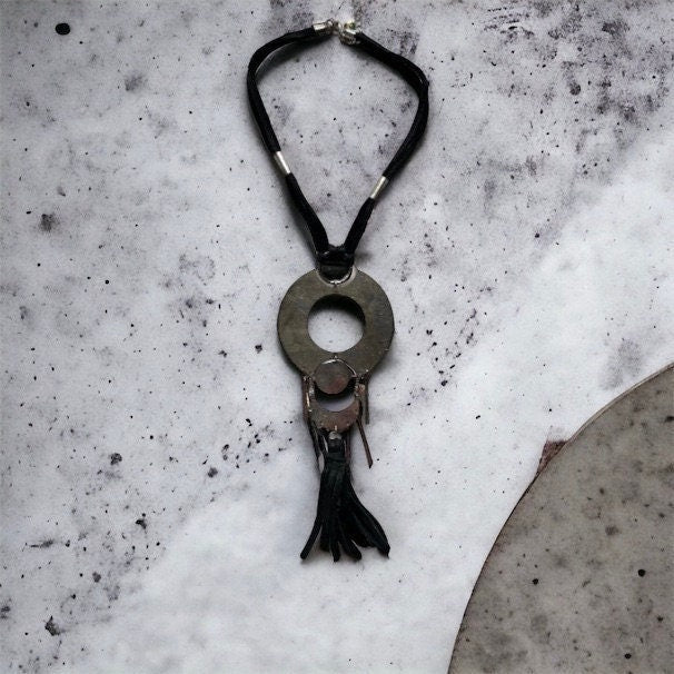 Unique vintage necklace with black suede and silvertone metal