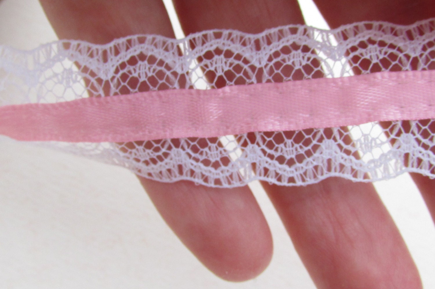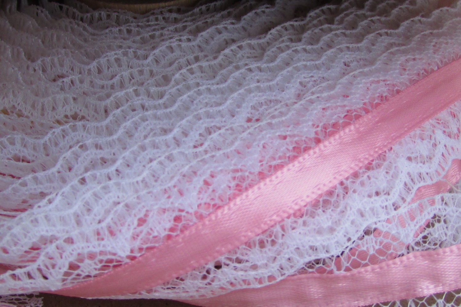 Victorian-style vintage narrow white lace with pink ribbon in the center - by the yard
