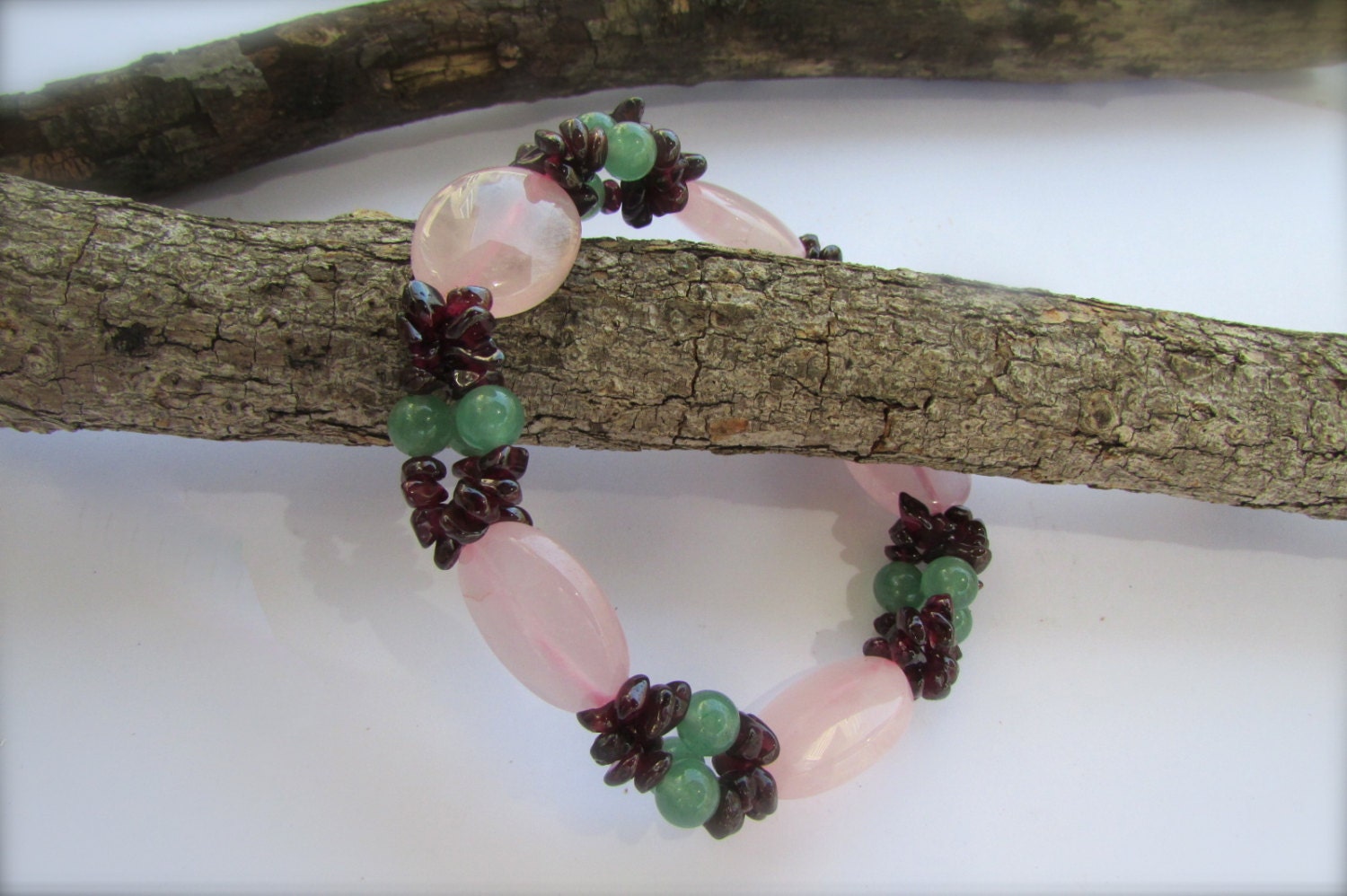 Vintage beadwoven gemstone bracelet - pink quartz, garnet and more