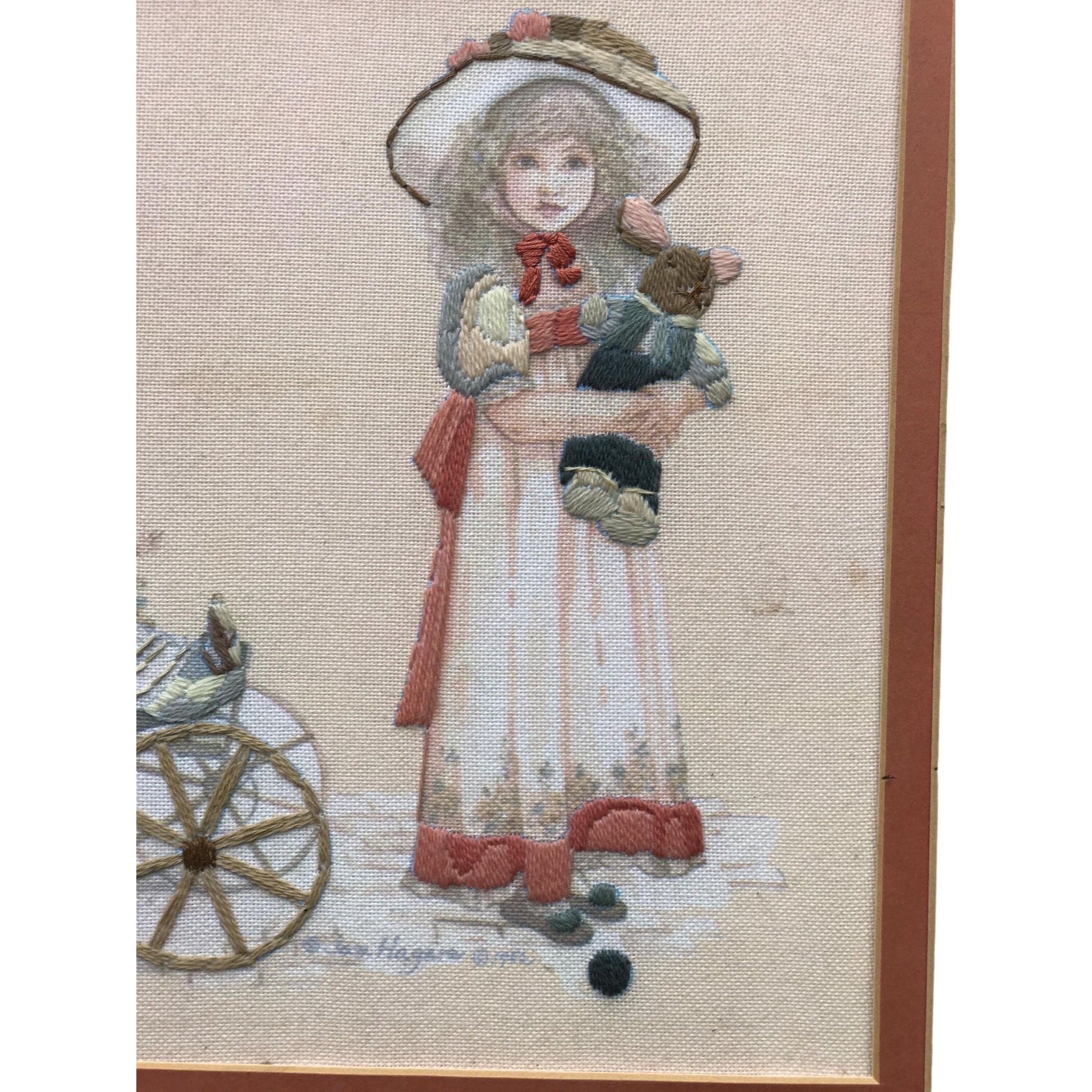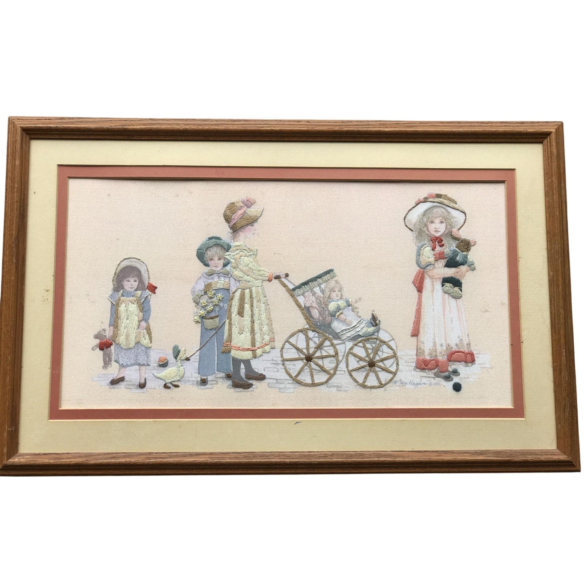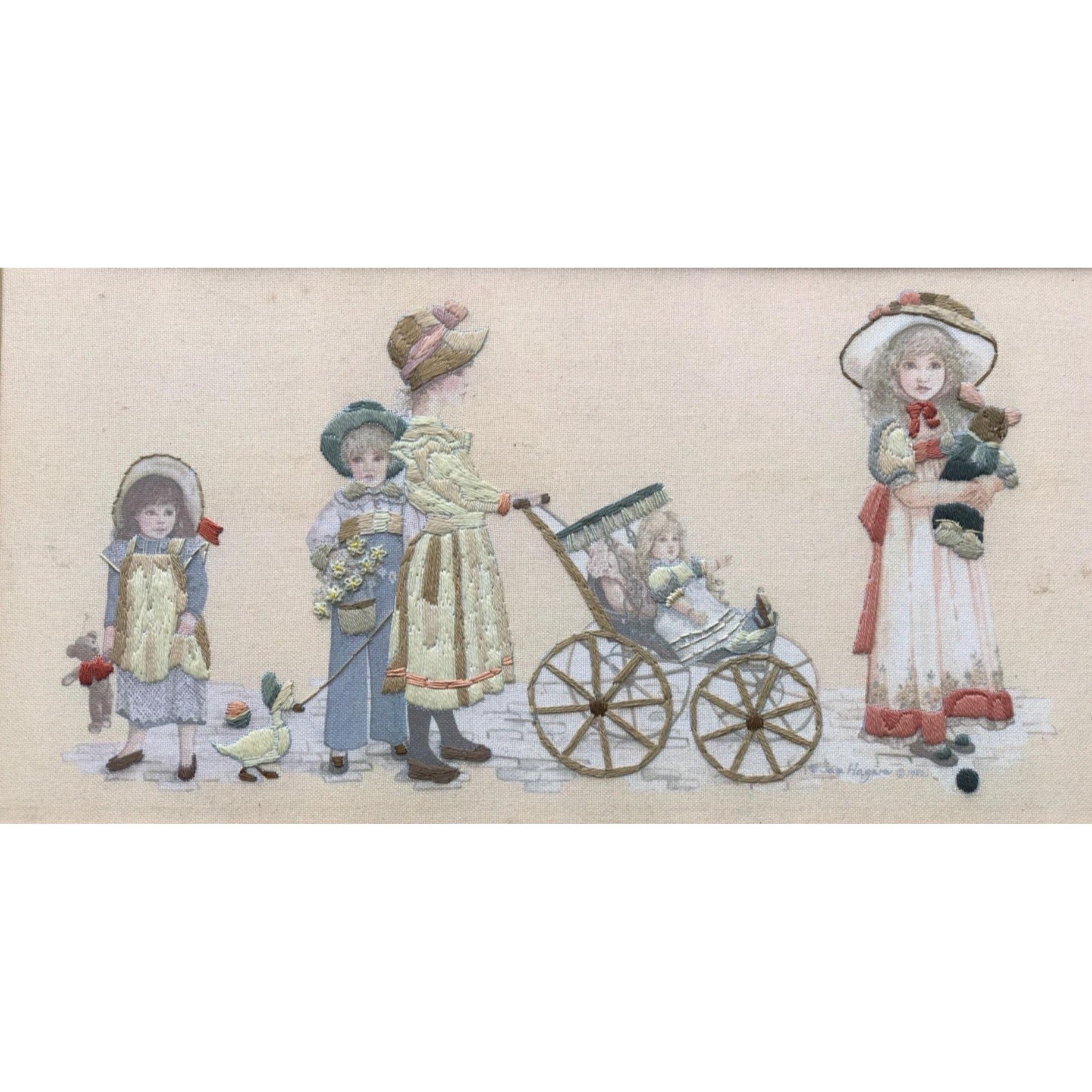 This charming vintage embroidered artwork features a Victorian-era scene with children and a stroller, beautifully detailed in soft hues. Its intricate craftsmanship and nostalgic appeal make it a unique addition to a traditional or antique-themed decor collection.