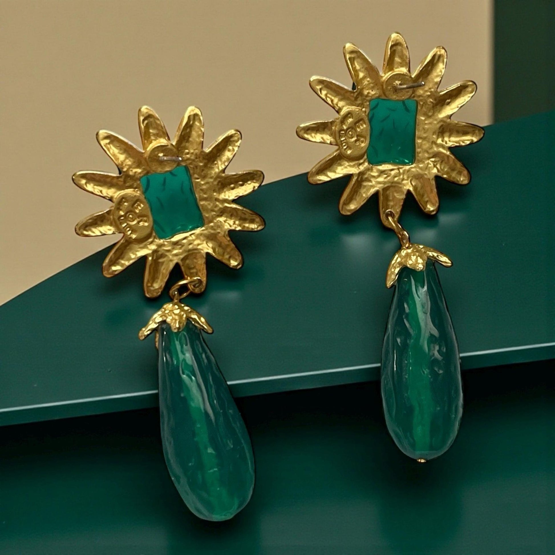 Make a vibrant statement with these striking vintage green drop earrings featuring gold-tone sunburst tops and elongated teardrop dangles (the green might be resin?). The textured square centers and striking green details give them a unique retro look—bold, artistic, and full of character.