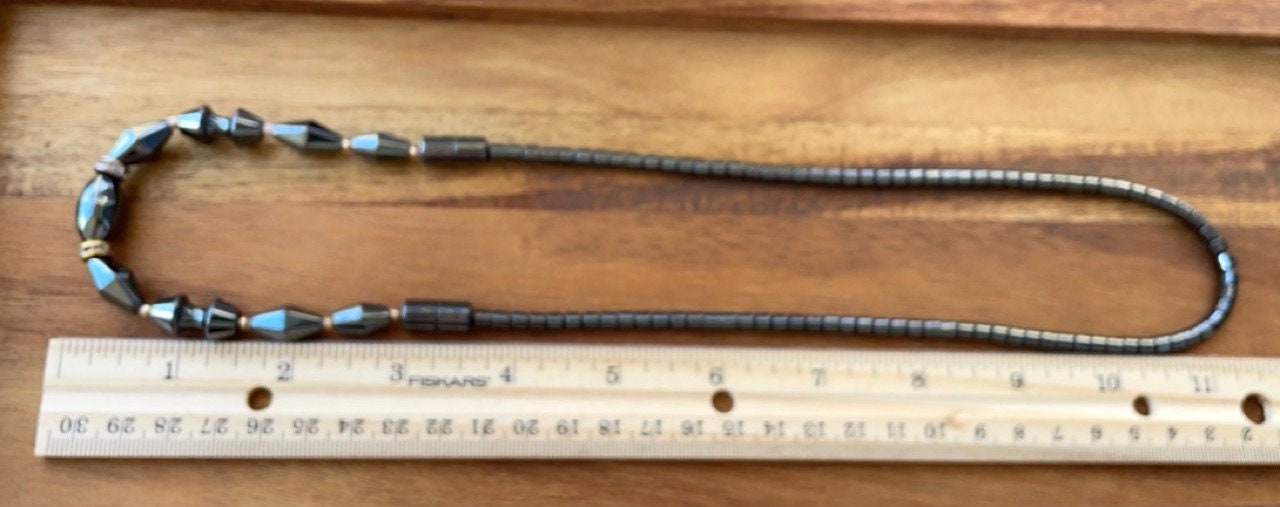 Vintage hematite necklace with uniquely shaped hematite beads and rhinestone spacers
