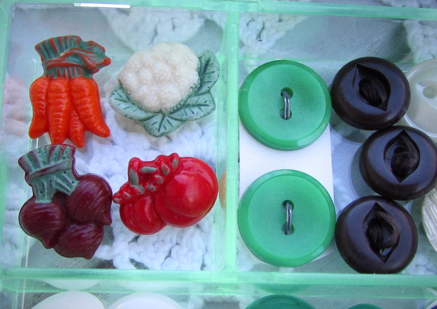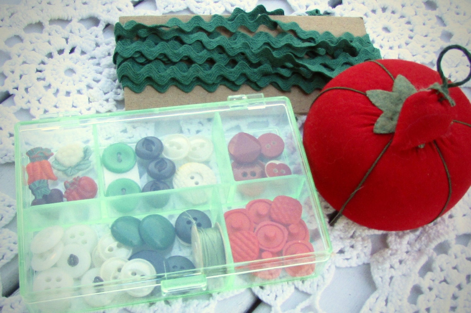 Vintage sewing inspiration box - filled with vintage buttons and sewing supplies shown - vegetable theme - in the shades of red and green